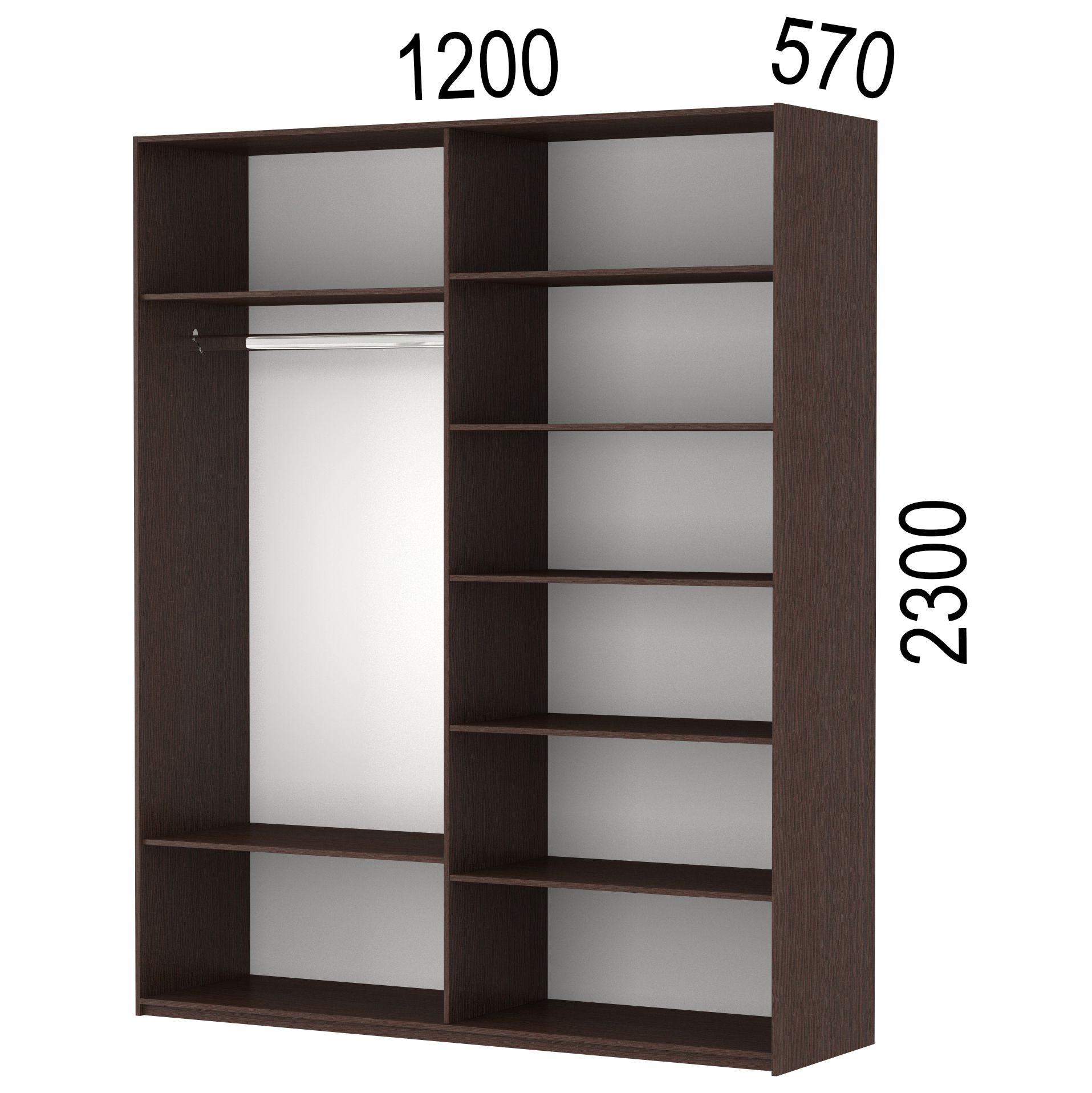 НовинкаестьШирина габаритная1200 ммВысота габаритная2300 ммГлубина габаритная570 ммУгловойнетТип дверейраздвижные (купе)Число дверей2Материал фасадовстеклоВыдвижные ящикиза дополнительную платуТип направляющих в ящикахшариковыеШтангастандартнаяМатериал корпусаЛДСПЗеркалонетКоличество упаковок4 штПоставкав разобранном видеПроизводствоБелореченскШирина1200 ммГарантия24 месяца -
