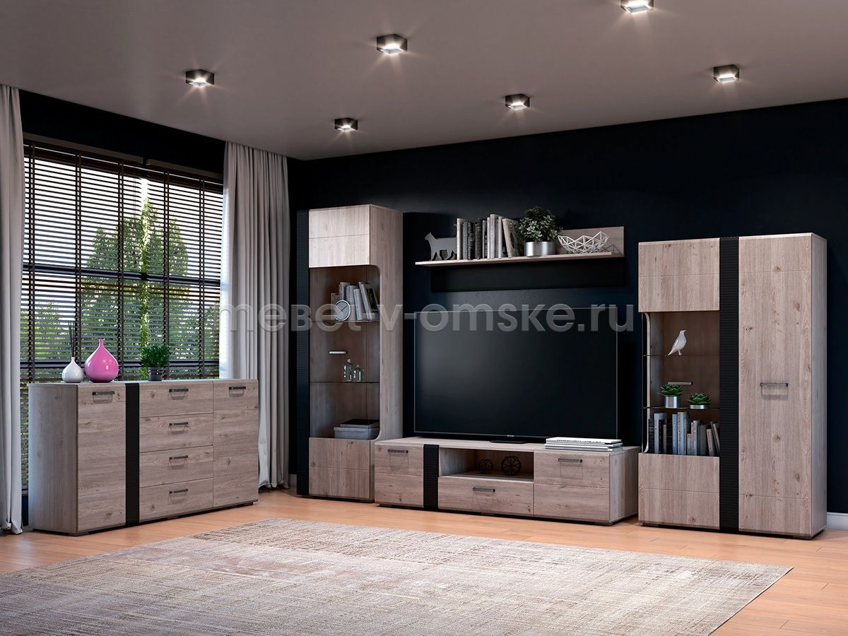 Гостиная "Бриз" модульного типа включает стандартный набор мебели: различные шкафы для хранения с витринами, комод, подставку под телевизор и навесную полку.