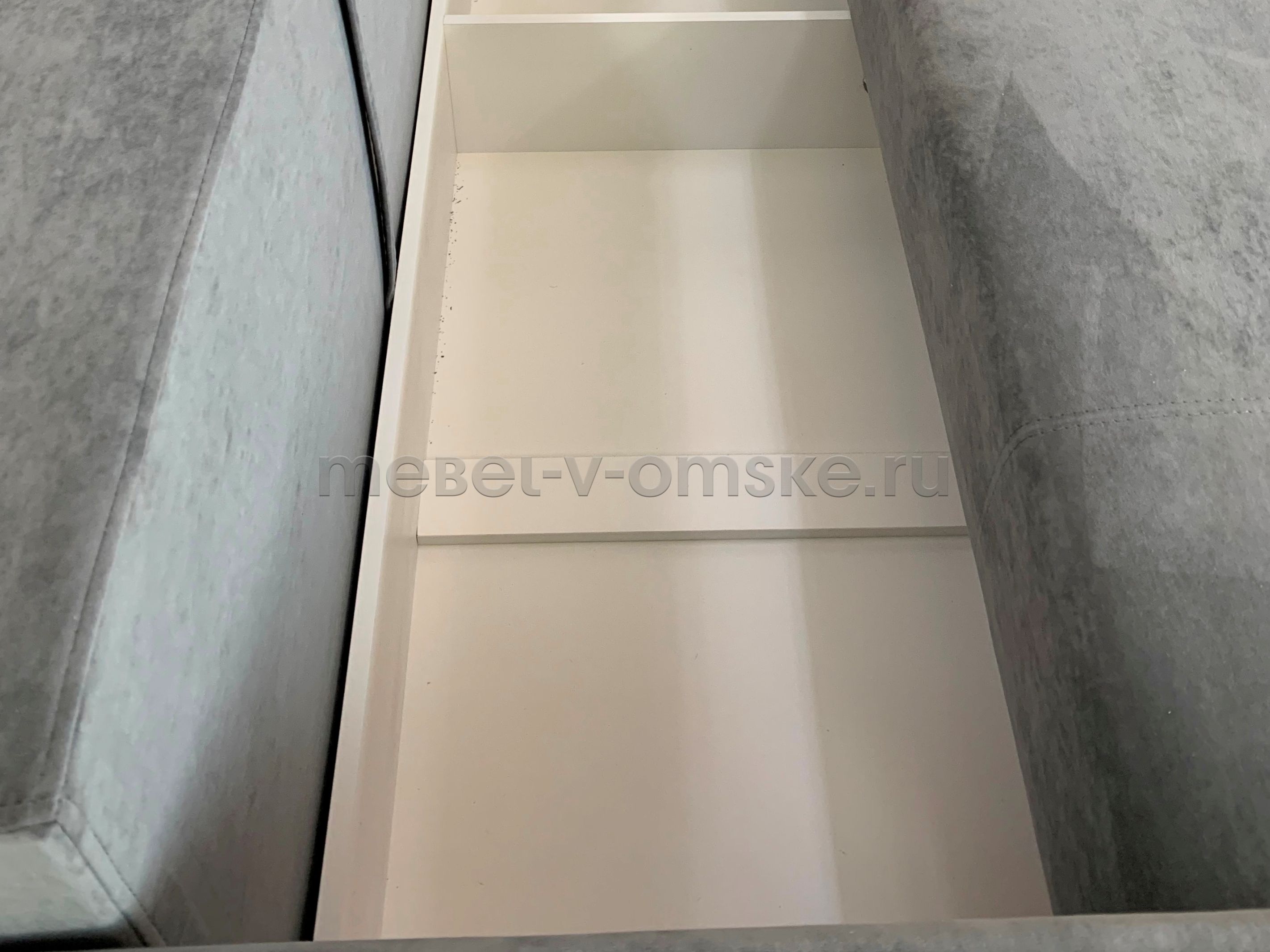 - Пространство для хранения. Под сиденьем и оттоманкой расположены просторные ящики для постельных принадлежностей, подушек и других вещей, что повышает функциональность и практичность дивана.