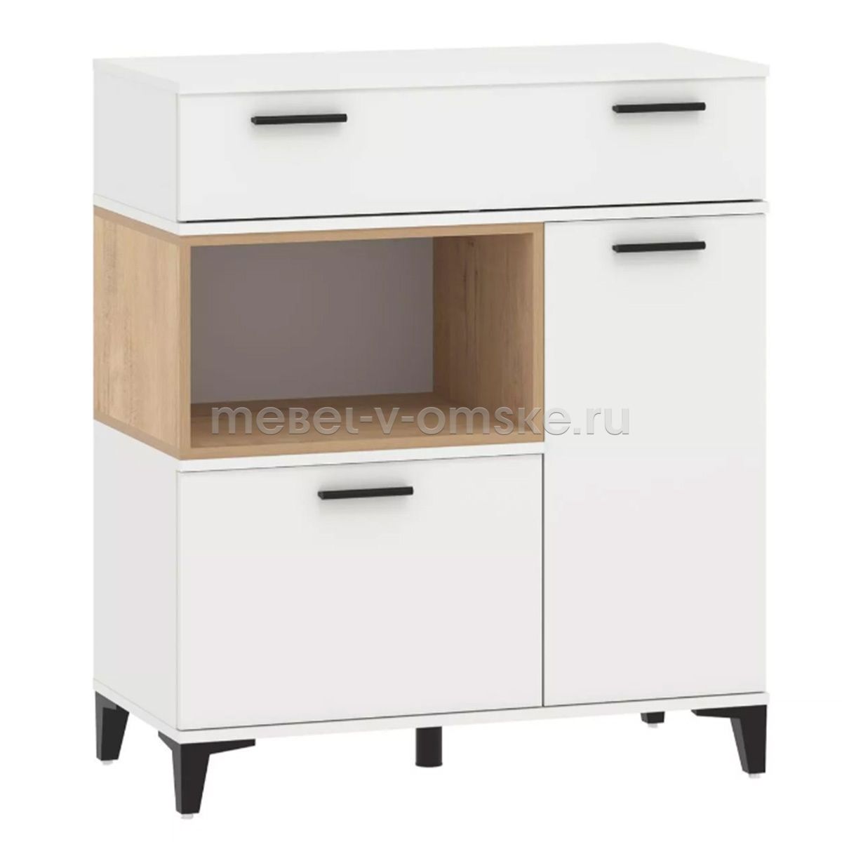 - Конструктив. Полки и стеллажи легко разместят книги, элементы декора, а также памятные вещи. Вместительные ниши за распашными дверями будут удобны для хранения необходимых мелочей. Функциональный шкаф - настоящая находка для ценителей экономии пространства, а высокие опоры облегчат процесс уборки.