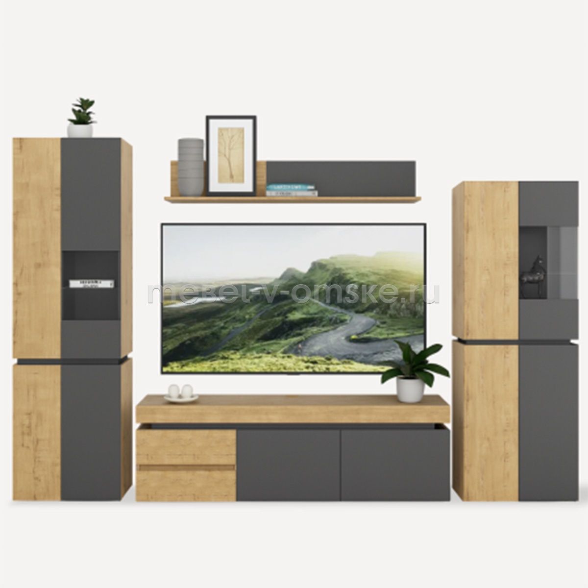- Конструктив. Стенка включает в себя два пенала разной высоты, оснащенных полками для хранения, а также стеклом-витриной на фасадах. Тумба ТВ имеет размер ТВ-ниши 1355 мм., включая в себя дополнительное место хранения за распашными дверцами и двумя выдвижными ящиками.