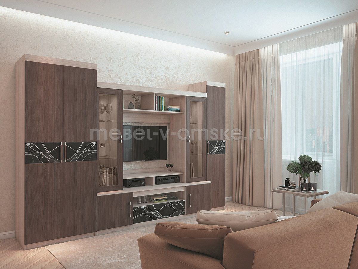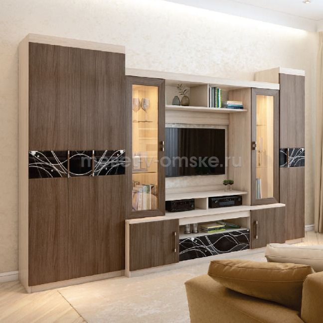 - Продуманная конструкция. Комплект включает в себя всё необходимое для комфортабельного обустройства гостиной комнаты: шкафы для белья и одежды, практичную стенку с нишей для телевизора, витринами для демонстрации предметов декора, закрытыми отделениями для хранения массы полезных вещей.