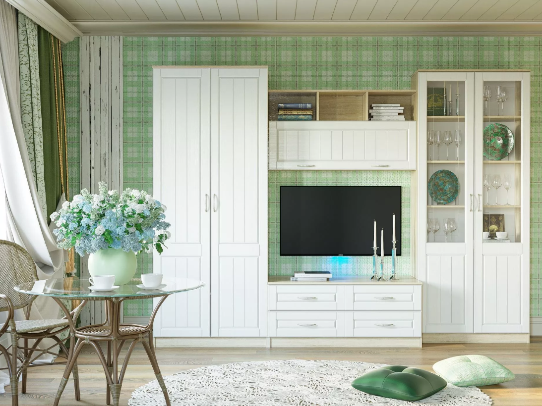 - Конструктив. Отличительной чертой комплектации №1 является симметричность. Модули одинаковых форм и размеров расположены рядом друг с другом, образуя тем самым нишу под ТВ. Сочетание шкафа-витрины и шкафа для одежды позволит максимально функционально использовать пространство гостиной. Просто разместите за стеклянными дверцами те вещи, которыми хотите похвастаться, а предметы гардероба, документы и ценные вещи спрячьте за глухими фасадами.