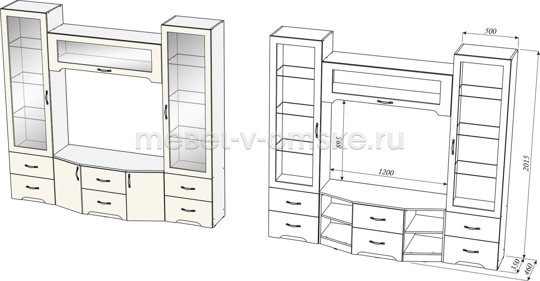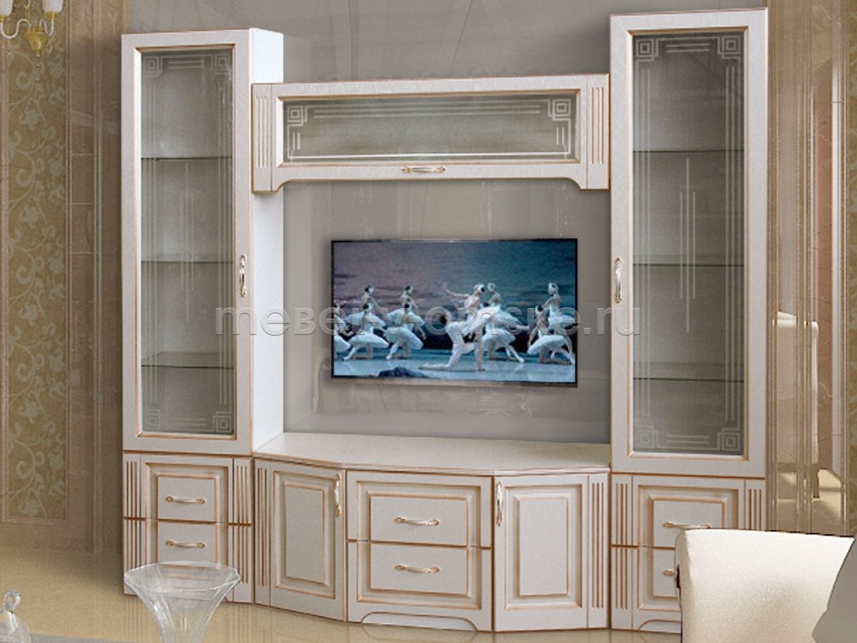 Особенности модели:- Продуманная конструкция – здесь есть всё для комфортного размещения различных аксессуаров и элементов декора: вместительная тумба под ТВ, выкатные ящики для хранения мелочей, два ящика с глухими дверцами, пеналы-витрины и верхнее отделение с фасадами из стекла могут демонстрировать Ваши сервизы, награды,коллекции.