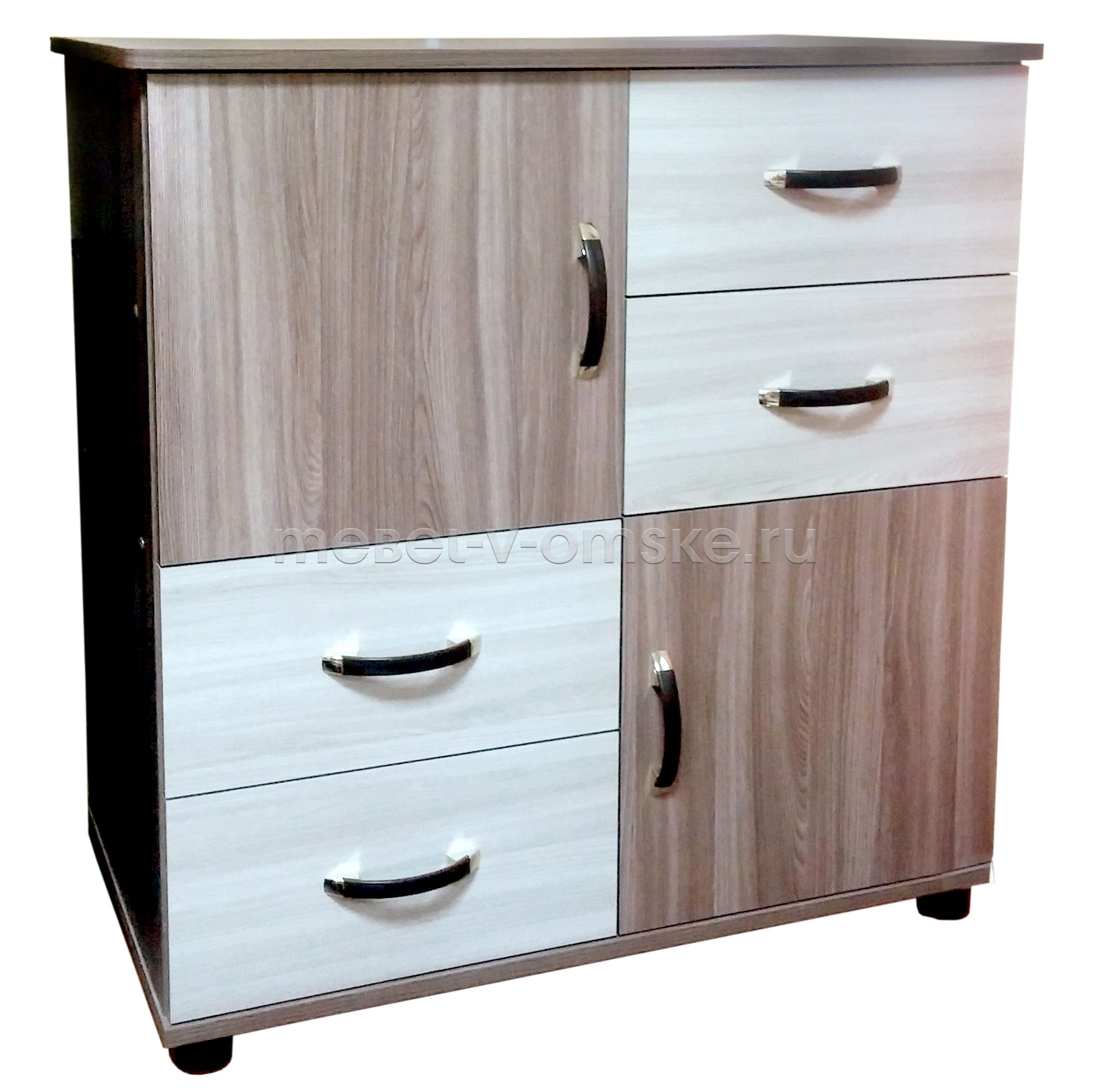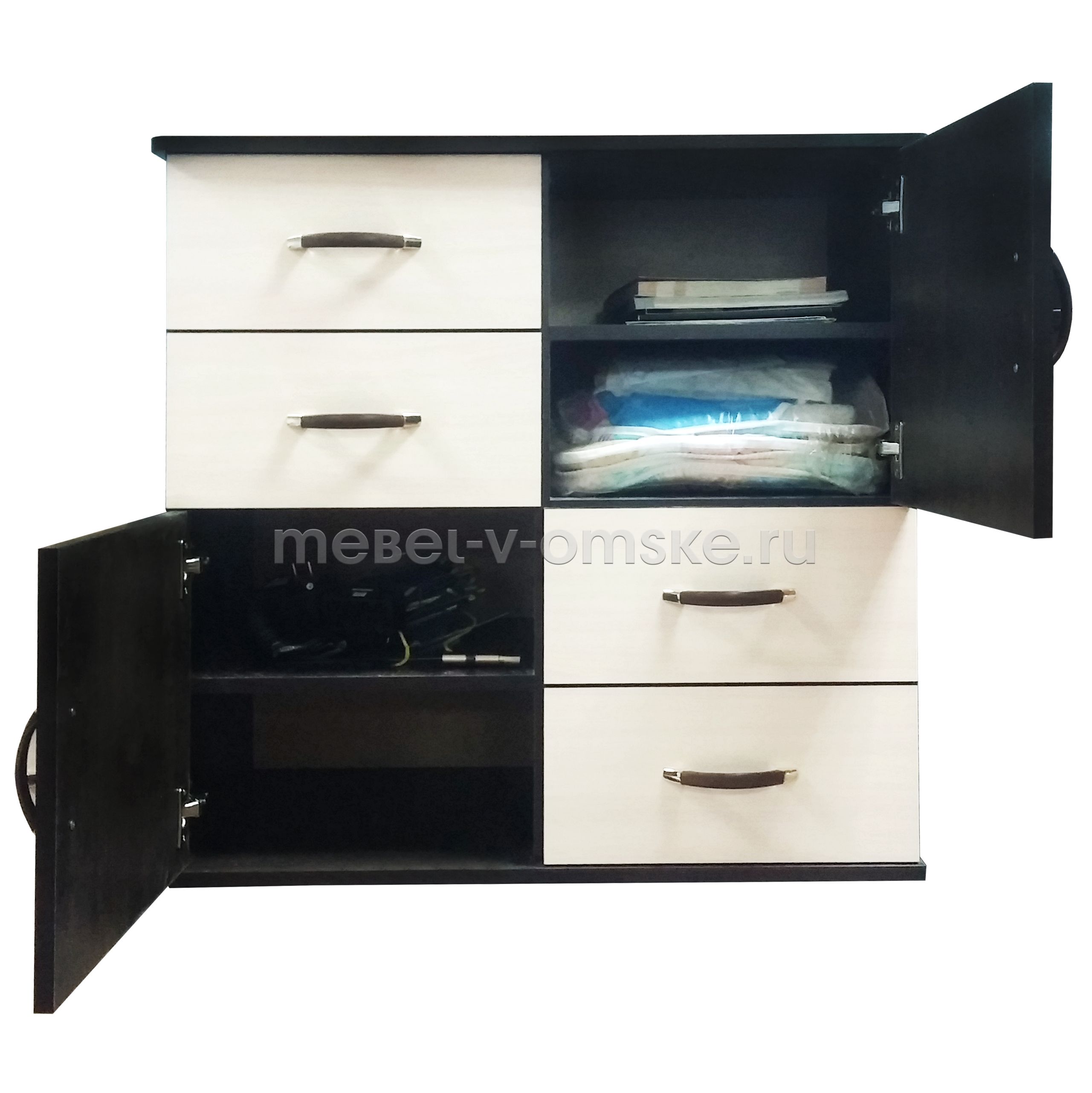 Особенности модели:- Отличная вместительность – комод снащён четырьмя выдвижными ящиками и двумя отделениями с распашными дверцами, всё создано для бережного хранения белья, одежды и мелких аксессуаров.