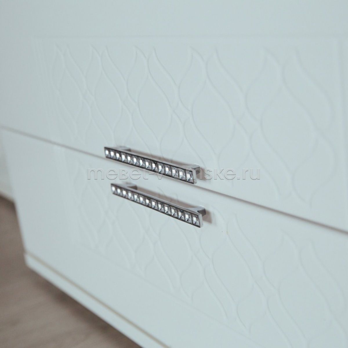 - Фурнитура. Металлические ручки с декоративными кристаллами и прямоугольные пластиковые опоры в 20 мм добавляют изысканности и стабильности. Ящики на шариковых направляющих полного выдвижения.