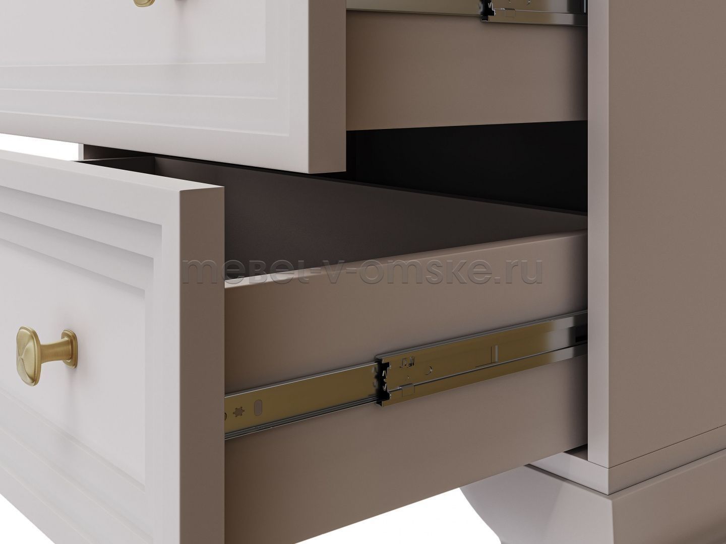 - Качественная фурнитура: Шариковые направляющие полного выдвижения обеспечивают плавное и бесшумное открывание ящиков, а также полный доступ к их содержимому. Металлические ручки в цвете брашированное золото добавляют финальный штрих роскоши и подчеркивают элегантность комода.