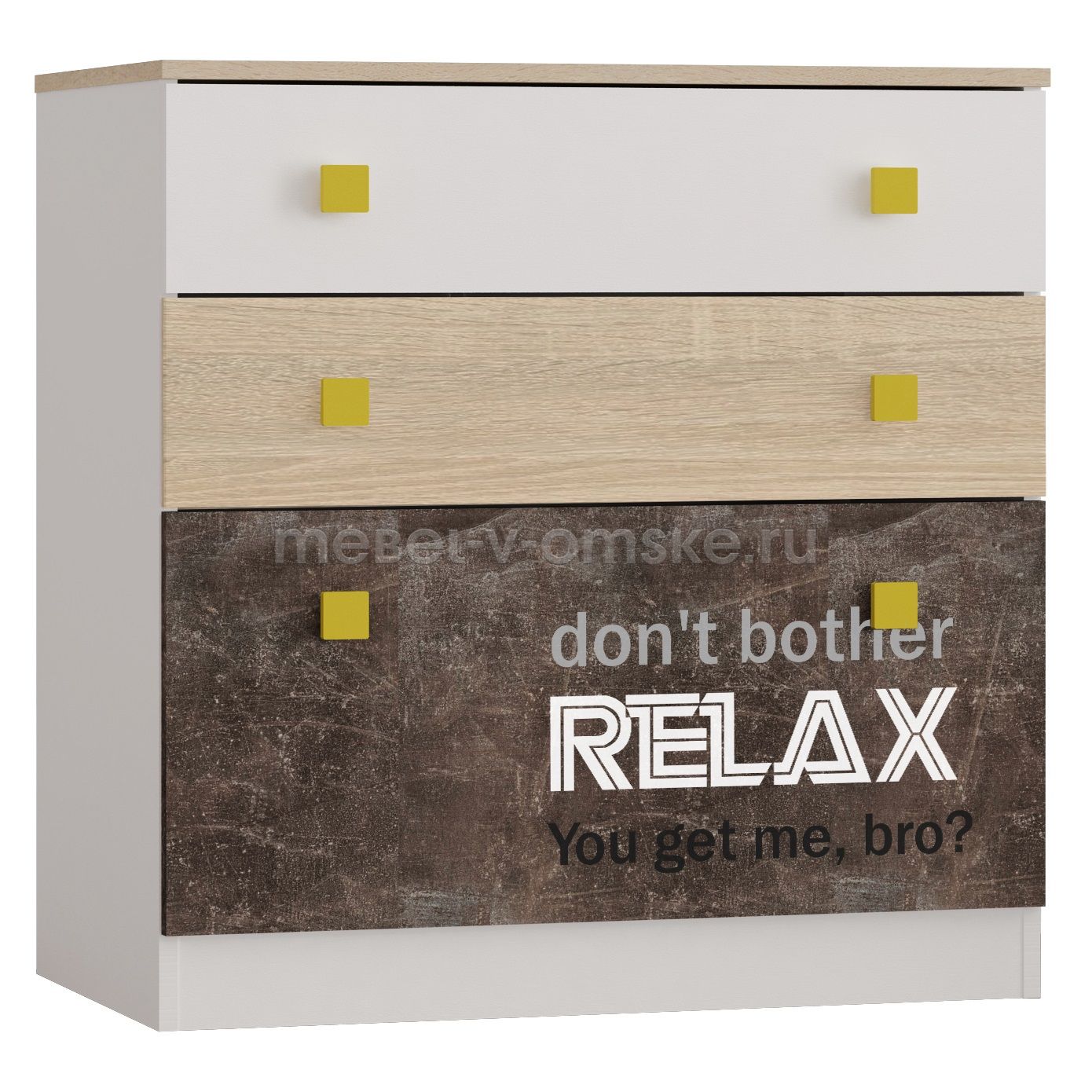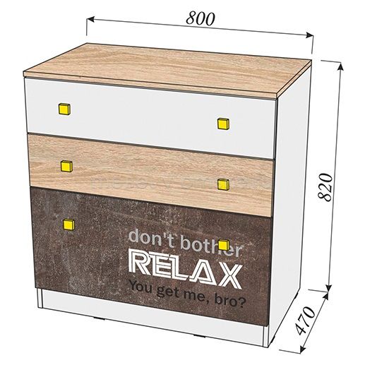 - Цвет. Модель выполнена в трех декорах ЛДСП Белый, ЛДСП Дуб Сонома и Ателье Темное, фасад ящиков украшает стильная фотопечать и ручки ярко желтого цвета.