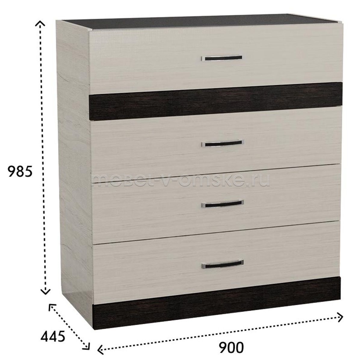 Особенности модели:- Функциональность – комод оснащён четырьмя вместительными ящиками для бережного хранения белья, одежды, различных аксессуаров.