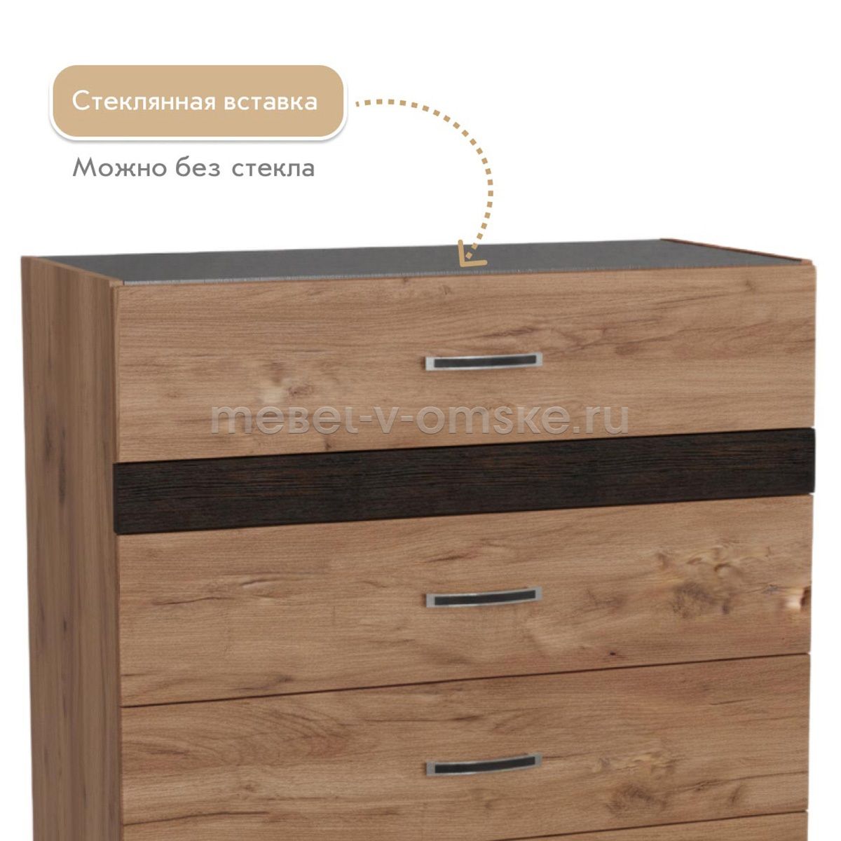 - Дизайн – традиционная форма комода креативно обогащена интересным решением: накладки МДФ на фасадах комода в контрастной расцветке подчёркивают современный стиль исполнения модели.