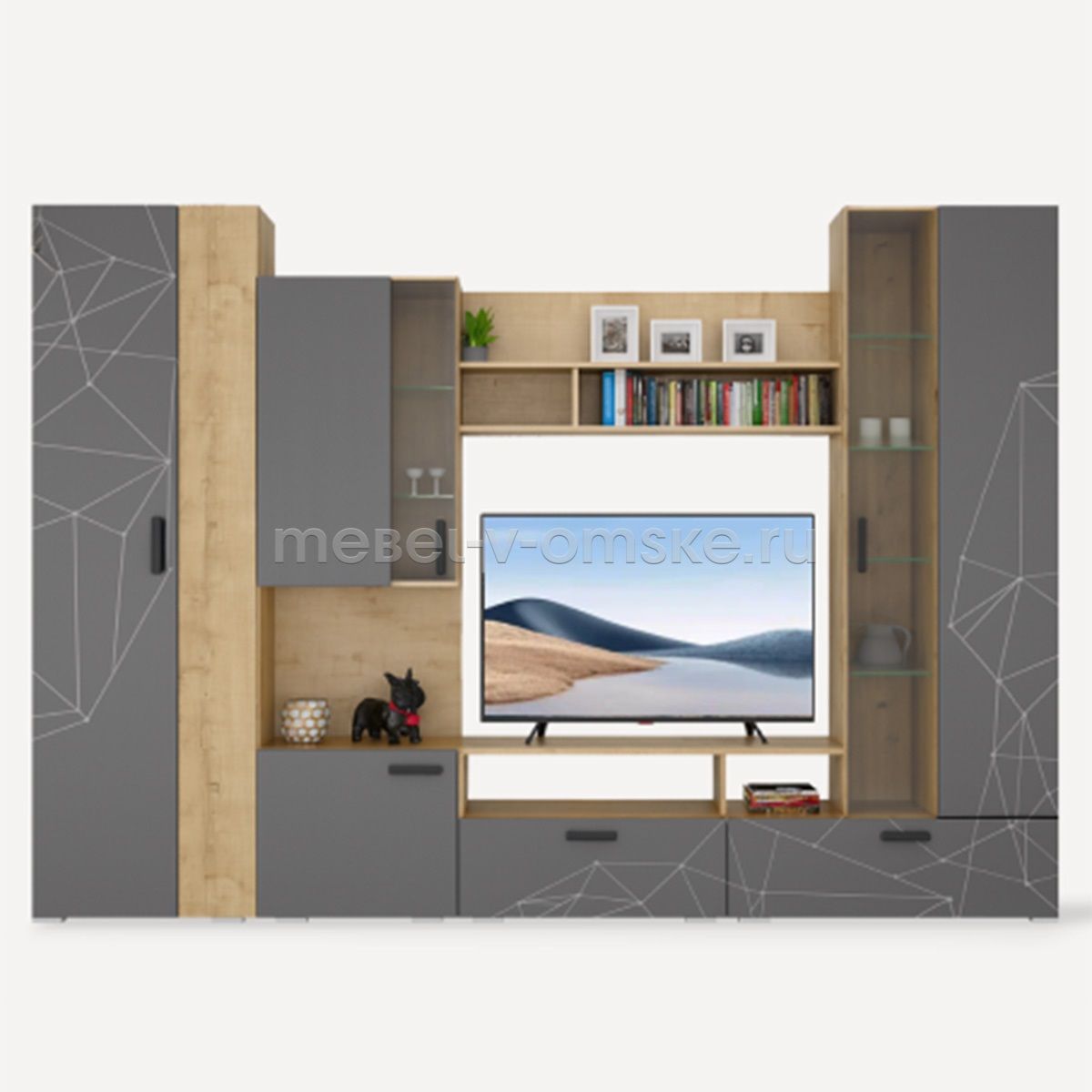 - Конструктив. Модель стенки включает в себя открытые и закрытые полки, удобную ТВ нишу 900*1200 мм. Два комбинированных пенала с полками из стекла и ЛДСП. Два выдвижных ящика в основании стенки. Пенал включает в себя 5 полок и штангу микролифт.