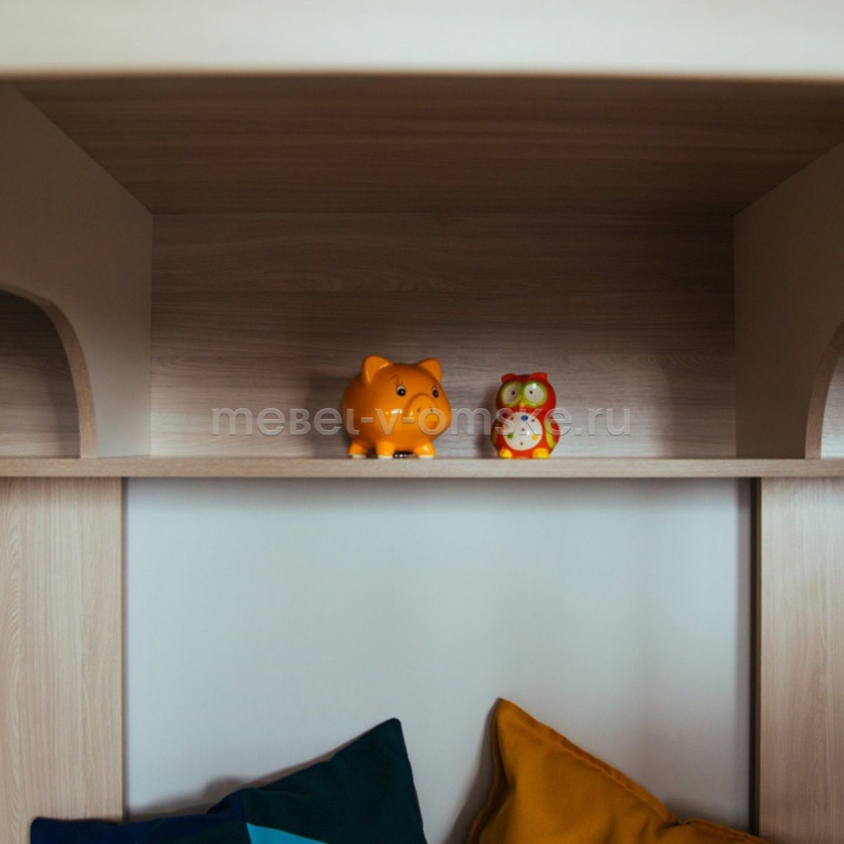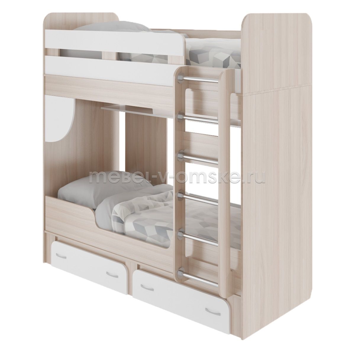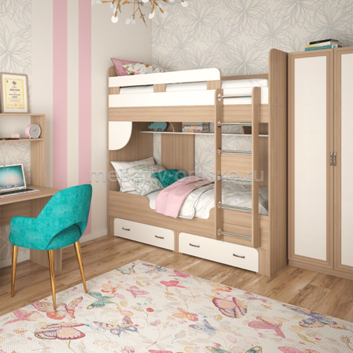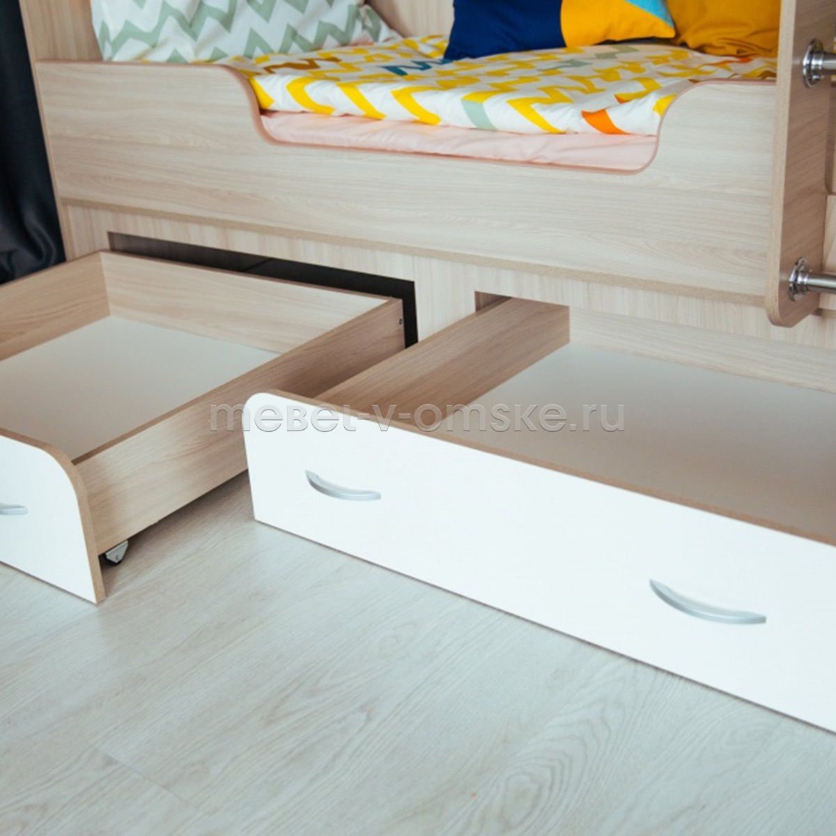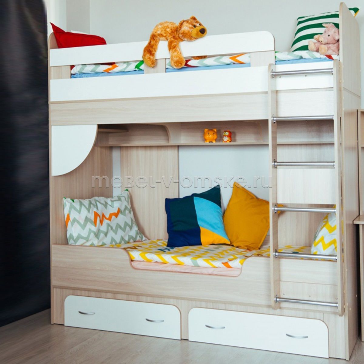 - Функциональность. Кровать имеет спальную зону 800*2000 мм. Верхнее спальное место с бортом высотой 360 мм. Удобны открытые полочки над нижним спальным местом. Перекладины лестницы выполнены из хромированных труб, которые крепятся к боковине фланцем и выдерживают нагрузку до 40 кг. глубина ящиков 1000 мм.
