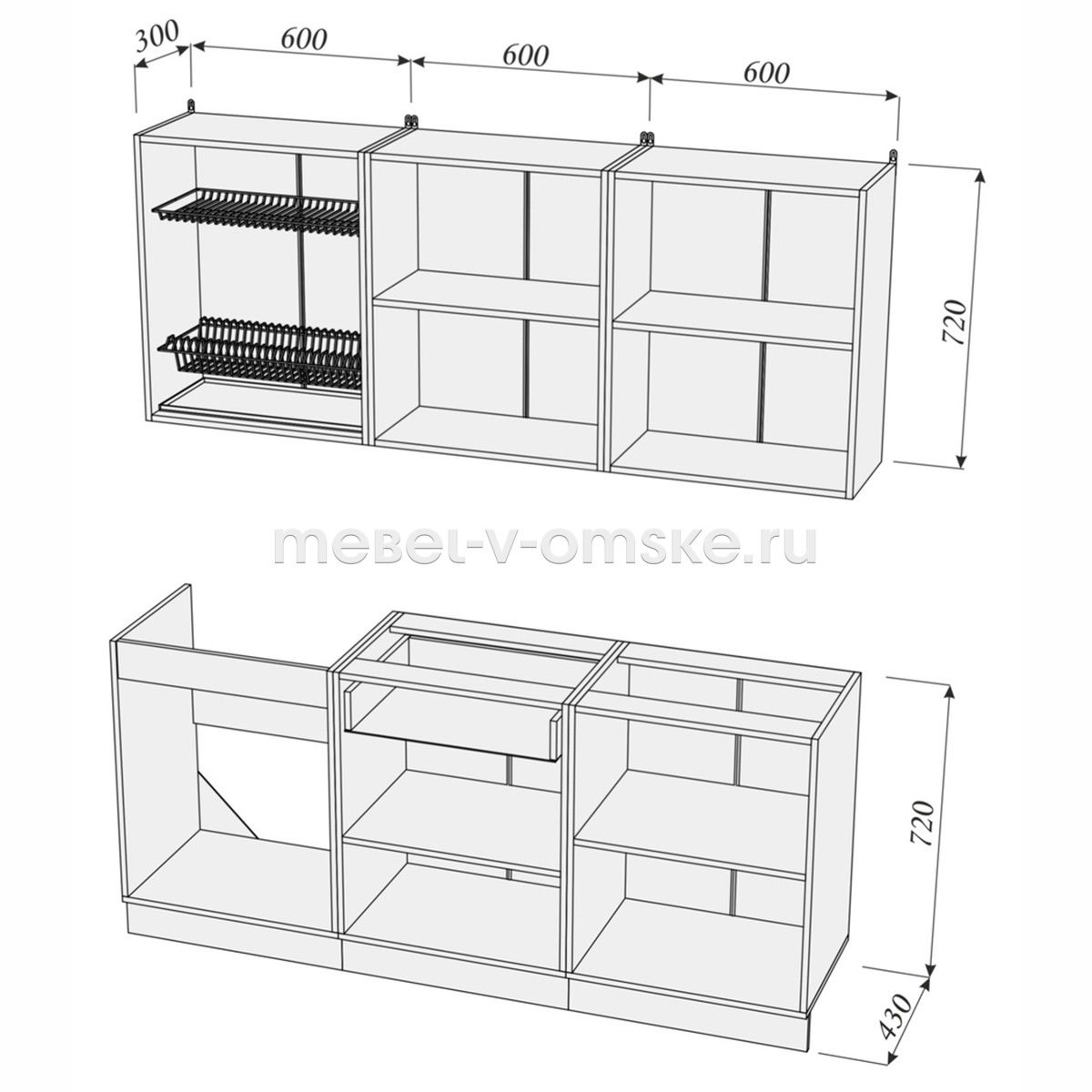 - Продуманная комплектация верхнего яруса кухонного гарнитура (1800) – состоит из трехнавесных шкафов, один из которых комплектуется посудосушителем.