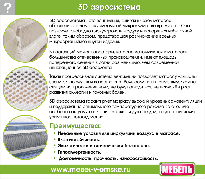 Специальная 3D аэросистема изделия включает в себя воздухопроницаемую 3D сетку, которая находится в боковой части, через неё выходит лишняя влага, благодаря этому матрас «дышит».