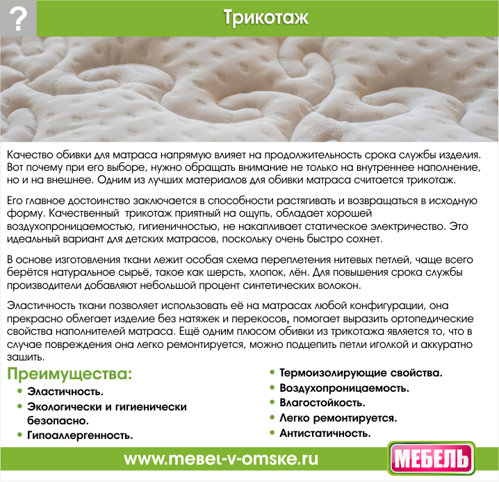 - Трикотаж стеганный- это многослойный, мягкий и эластичный материал, состоящий из трикотажной основы, наполнителя (синтепона) и нижней подкладки, соединенных между собой стежкой, образуя объемный, теплый и износостойкий текстиль для матрасов обеспечивающий комфорт и вентиляцию.