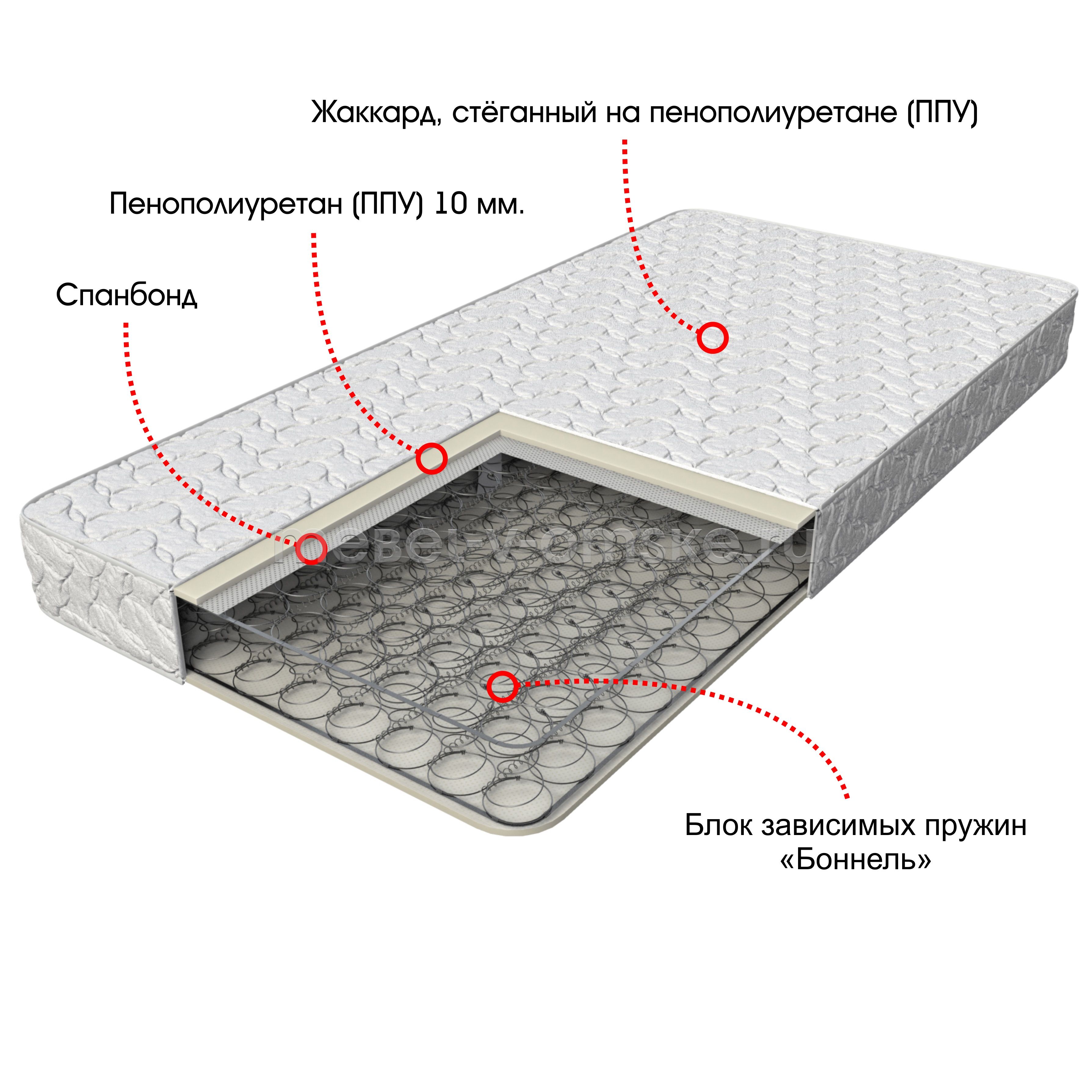 Матрас «Эконом» входит в линейку популярных моделей, характеризующихся лучшим сочетанием цены и функциональности. Пружинный блок «Боннель» с 2-мя рамками гарантирует изделию надёжность и прочность. Матрас "Эконом" стоит дешево т.к. имеет основной минимум наполнителей и обивку из синтетической ткани.