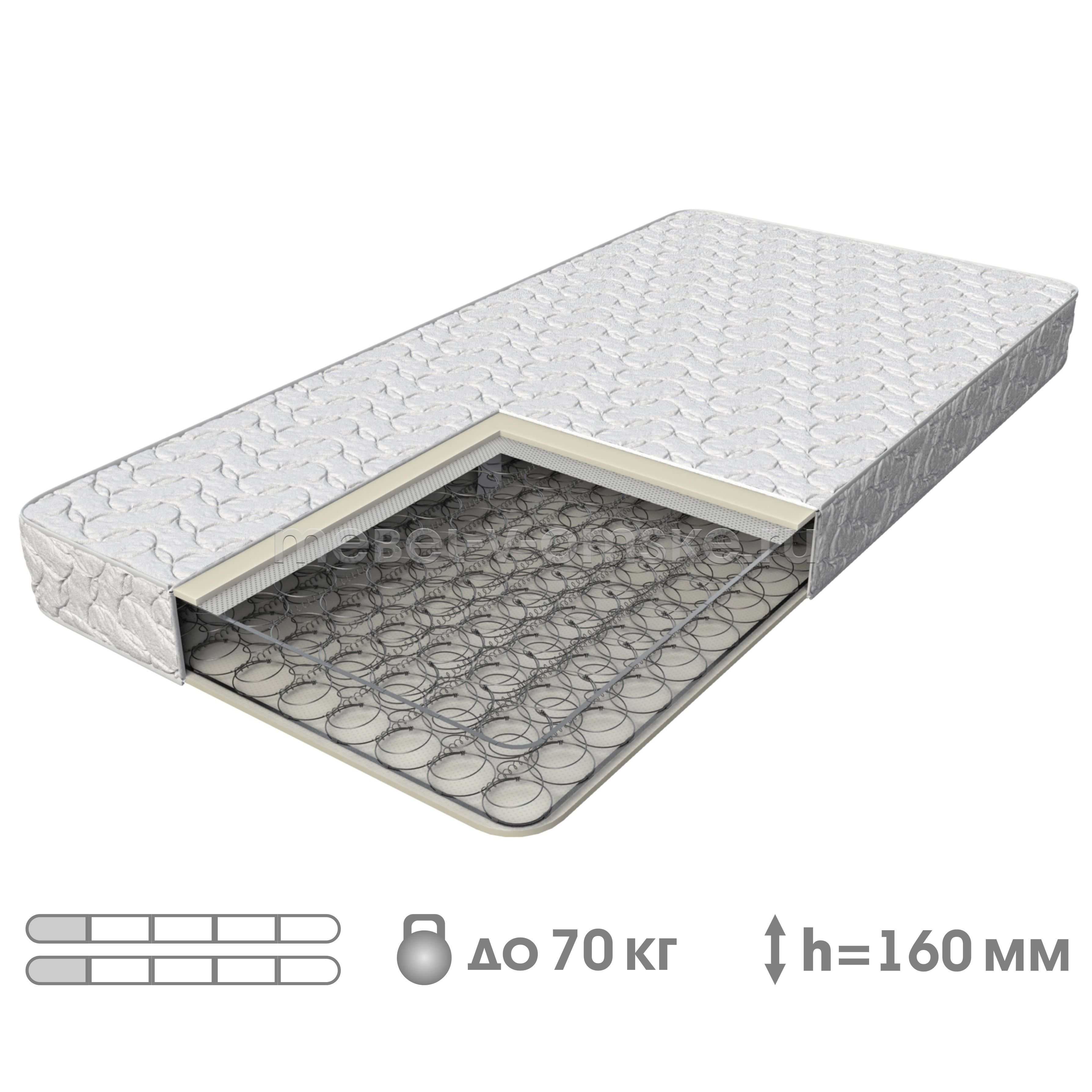 Гарантия18 месяцевШирина1600 ммВысота160 ммНагрузка на местодо 70 кг.Уровень жесткостинизкийОсноваЗависимые пружиныОбивкаЖаккард синтетическийТип пружинЗависимые пружины "Боннель"Высота пружин140 ммКоличество пружин на 1 кв.м.120ПроизводствоОмск -