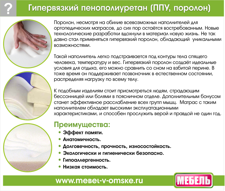 - Memory – это искусственная полимерная пена с высокой упругостью и чувствительностью к колебаниям температур окружающей среды. Главная особенность заключается в возможности поверхности четко повторять контуры тела человека, из-за чего на тело не оказывается давление поверхности.