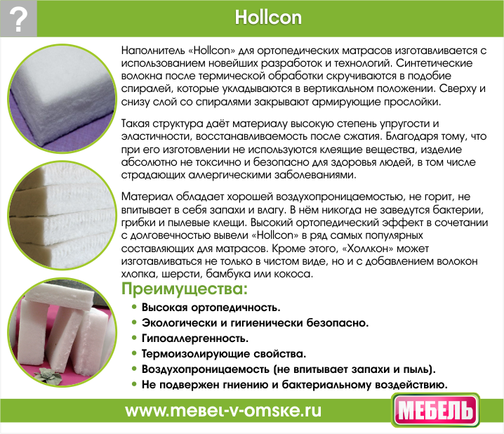- Трикотаж стеганный на HolLcon - это комфортный, дышащий и мягкий вариант, сочетающий эластичность трикотажа с упругим, долговечным наполнителем Холконом (полиэфирное волокно), который обеспечивает поддержку и износостойкость, создавая оптимальные условия для сна.