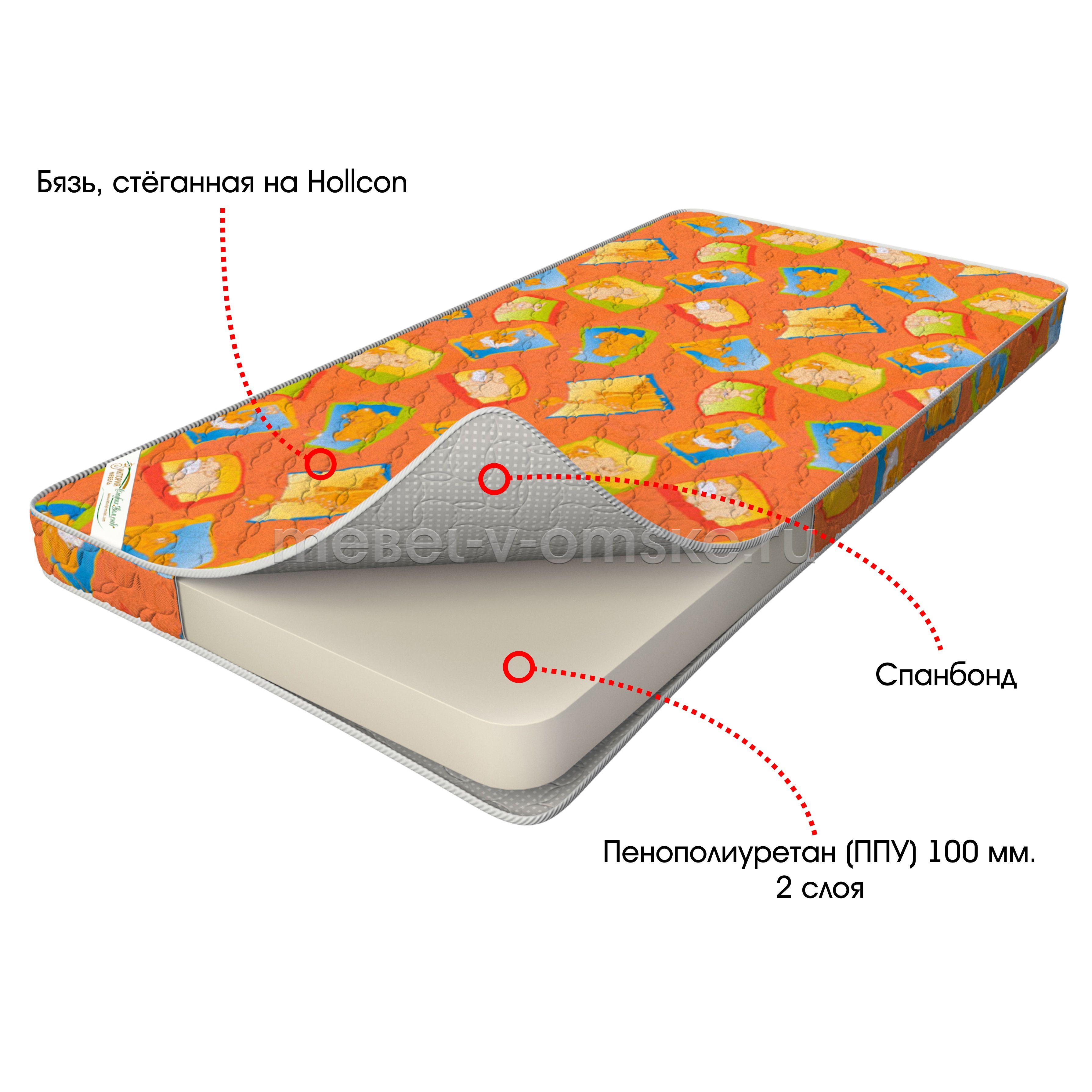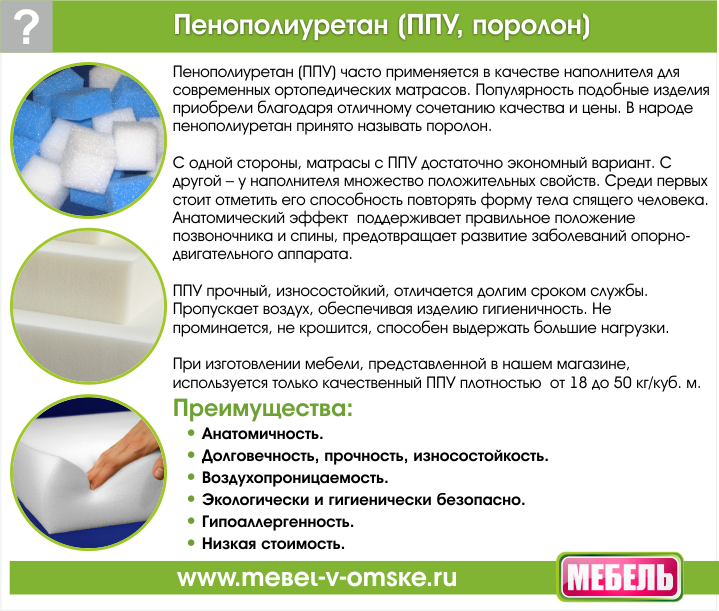 - Пенополиуретан, несмотря на синтетическое происхождение, обладает массой достоинств: гипоаллергенностью и гигиеничностью, способностью выдерживать интенсивные нагрузки без потери первоначального качества. Эластичность и упругость наполнителя позволит занять малышу удобную позу, способствующую спокойному и здоровому сну. Его ячеистая структура содействует свободной циркуляции воздуха, что гарантирует создание идеального микроклимата матраса и исключает накопления неприятных запахов.