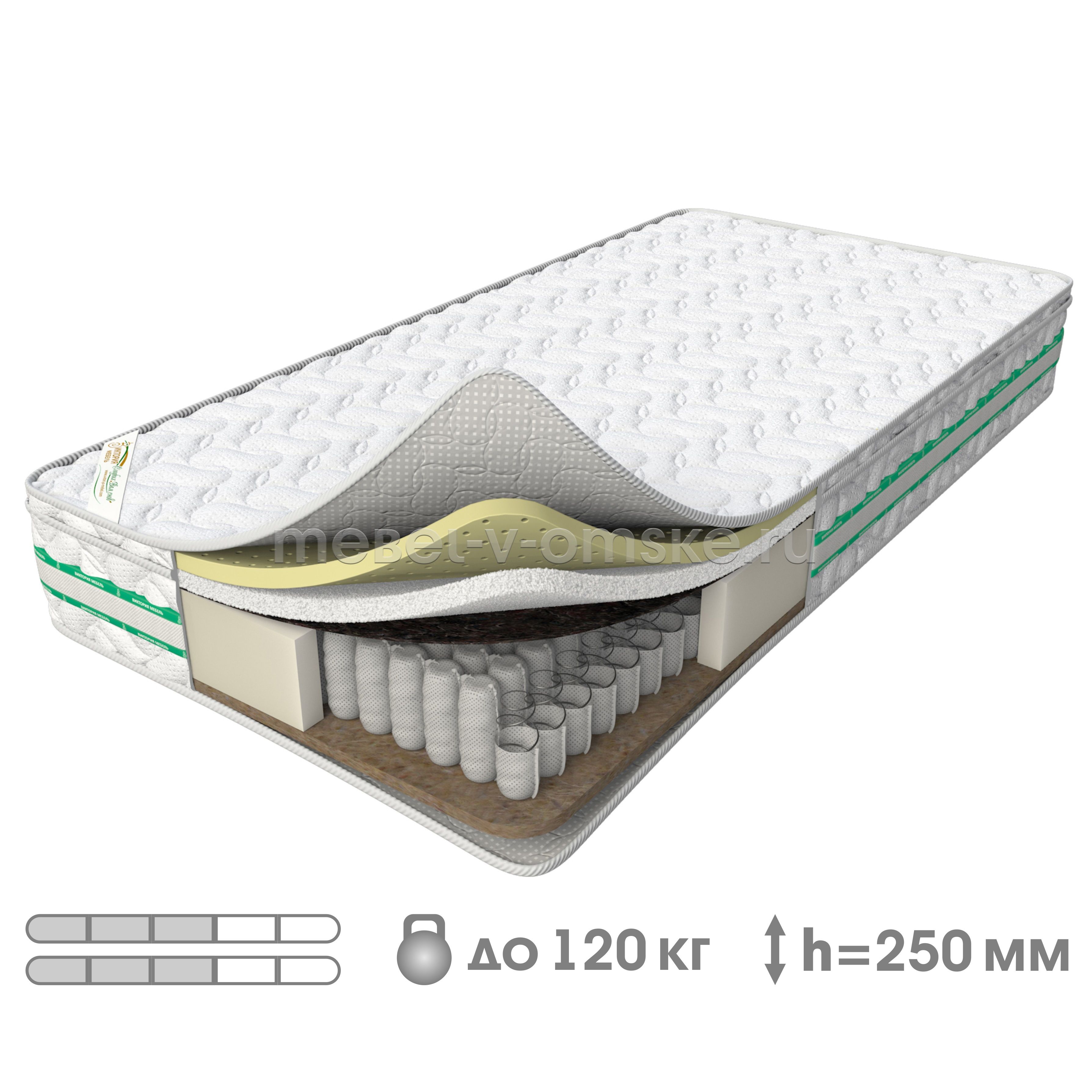 Гарантия18 месяцевШирина800 ммВысота250 ммНагрузка на местодо 120 кг.Уровень жесткостисреднийОсноваНезависимые пружиныОбивкаТрикотажЛатексныйестьКокосовыйестьТип пружинНезависимые пружины "Стандарт"Высота пружин140 ммКоличество пружин на 1 кв.м.256ПроизводствоОмск -