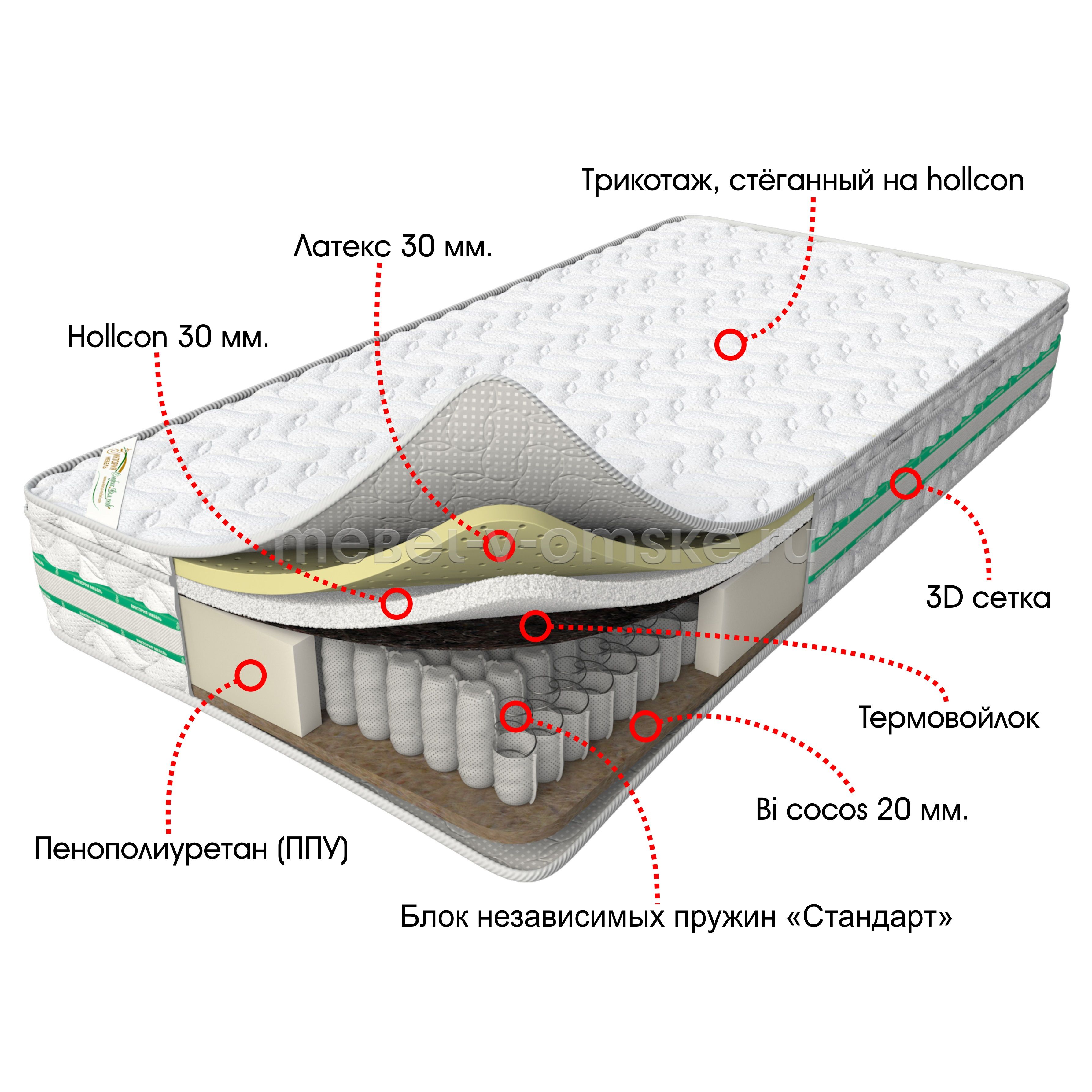- В основе матраса лежит блок независимых пружин «Стандарт» - обеспечивает правильное положение позвоночника во время сна, подстраиваясь под анатомические изгибы тела.