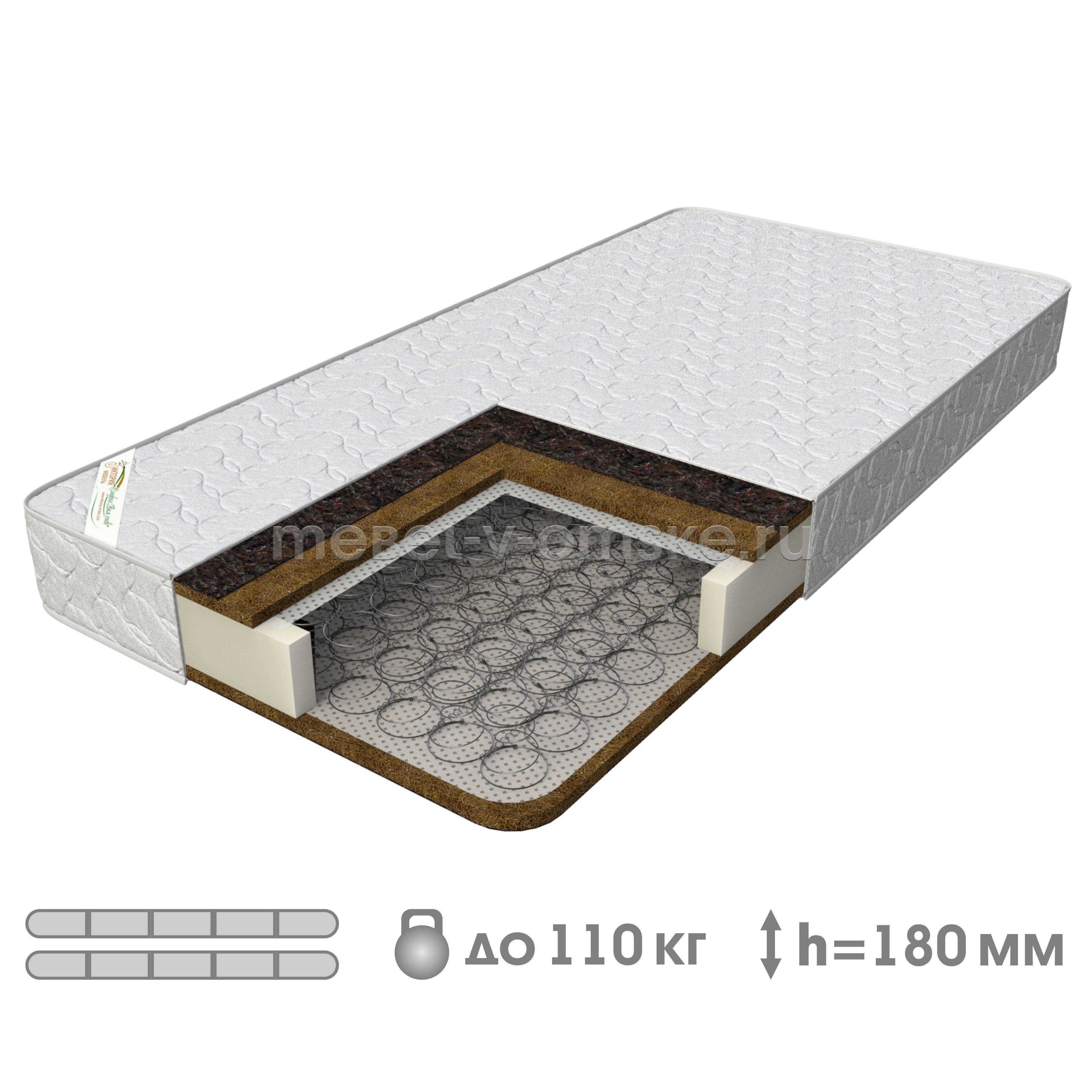 Гарантия18 месяцевШирина800 ммВысота180 ммНагрузка на местодо 110 кг.Уровень жесткостивысокийОсноваЗависимые пружиныОбивкаБязьКокосовыйестьТип пружинЗависимые пружины "Боннель"Высота пружин120 ммКоличество пружин на 1 кв.м.120 -