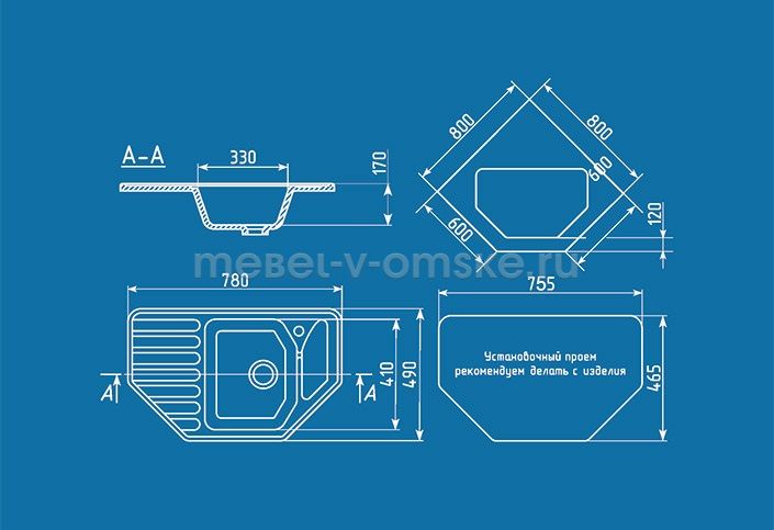 - Установка. Мойка врезная "U-109" подходит для угловых кухонных столов размером от 800х800 мм.