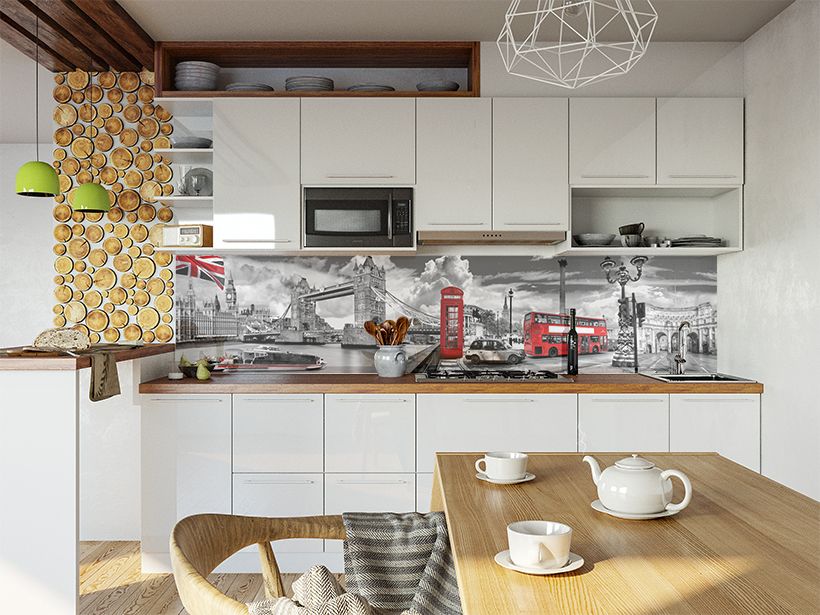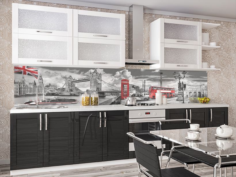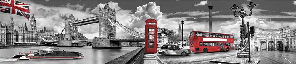 Кухонный фартук SP 123 с изображением Лондона - насыщенный красный цвет в сочетанием с серыми тонами основного пейзажа выглядят очень стильно и современно. подойдет как для кухонь с класическими фасадами, так и для дерзких современных стилей.
