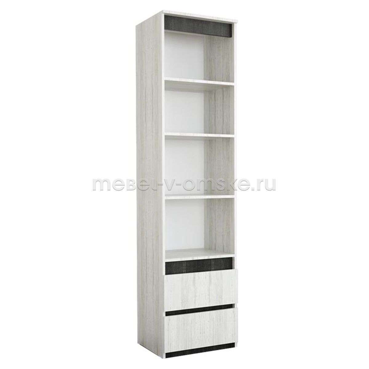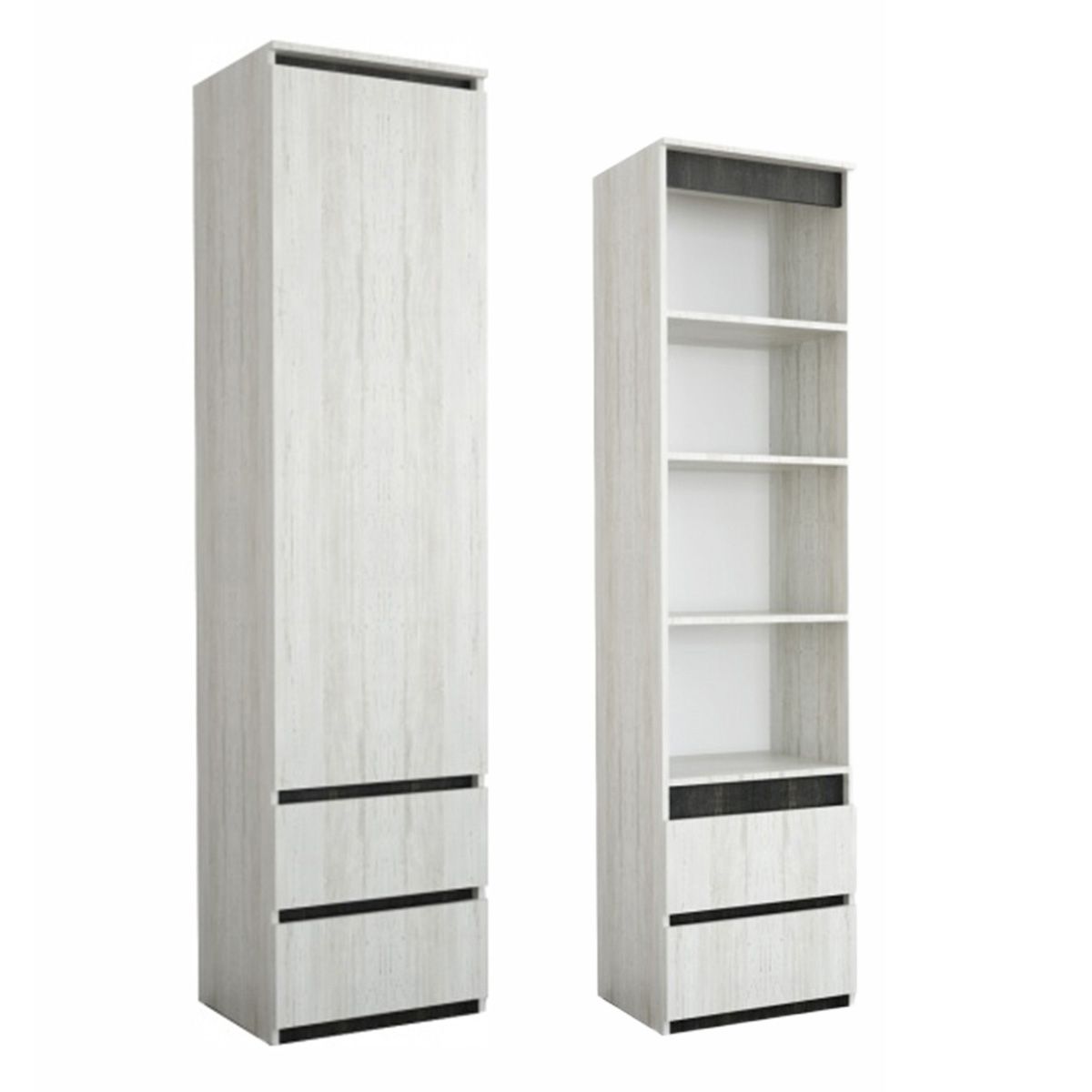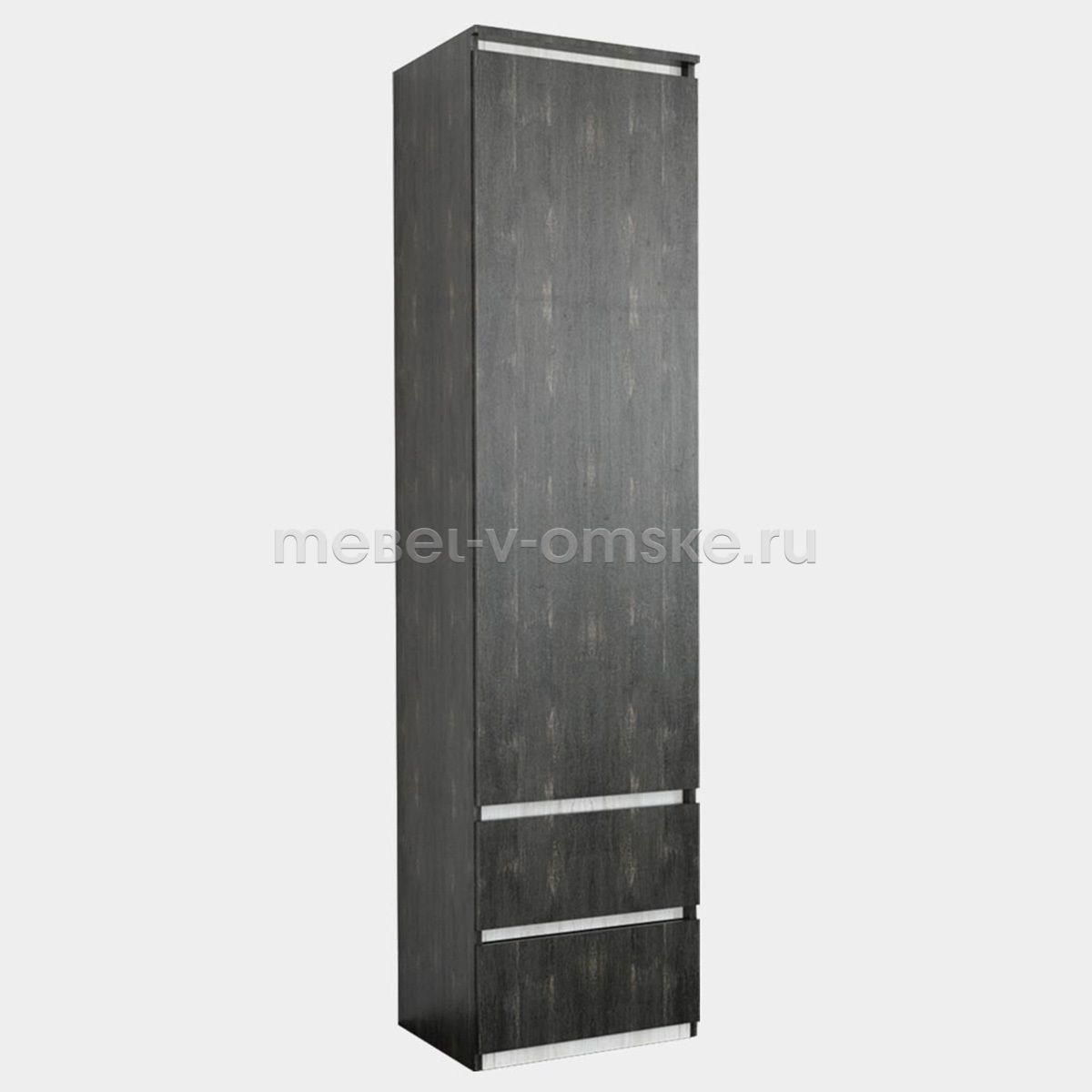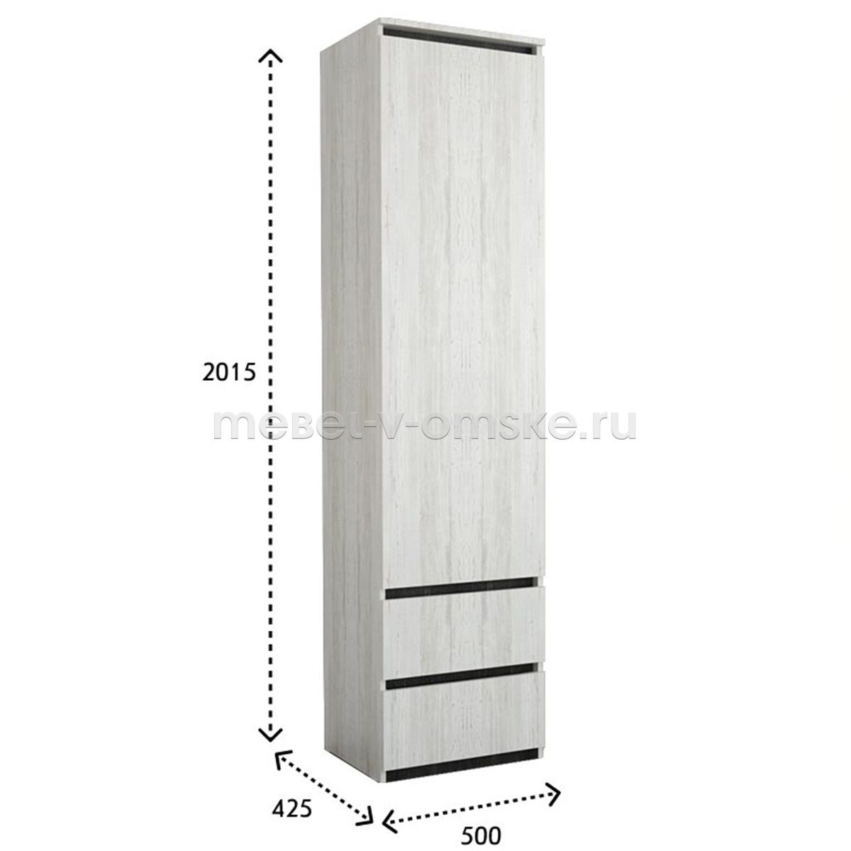 - Конструктив. Пенал включает в себя отделение с полками за распашной дверью и два выдвижных ящика в основании.