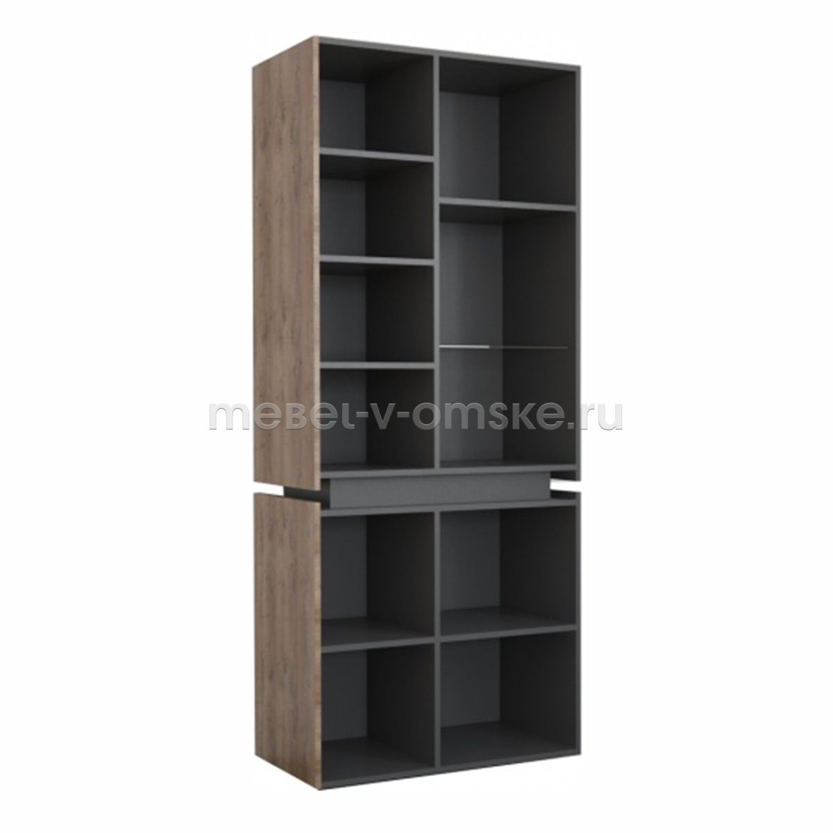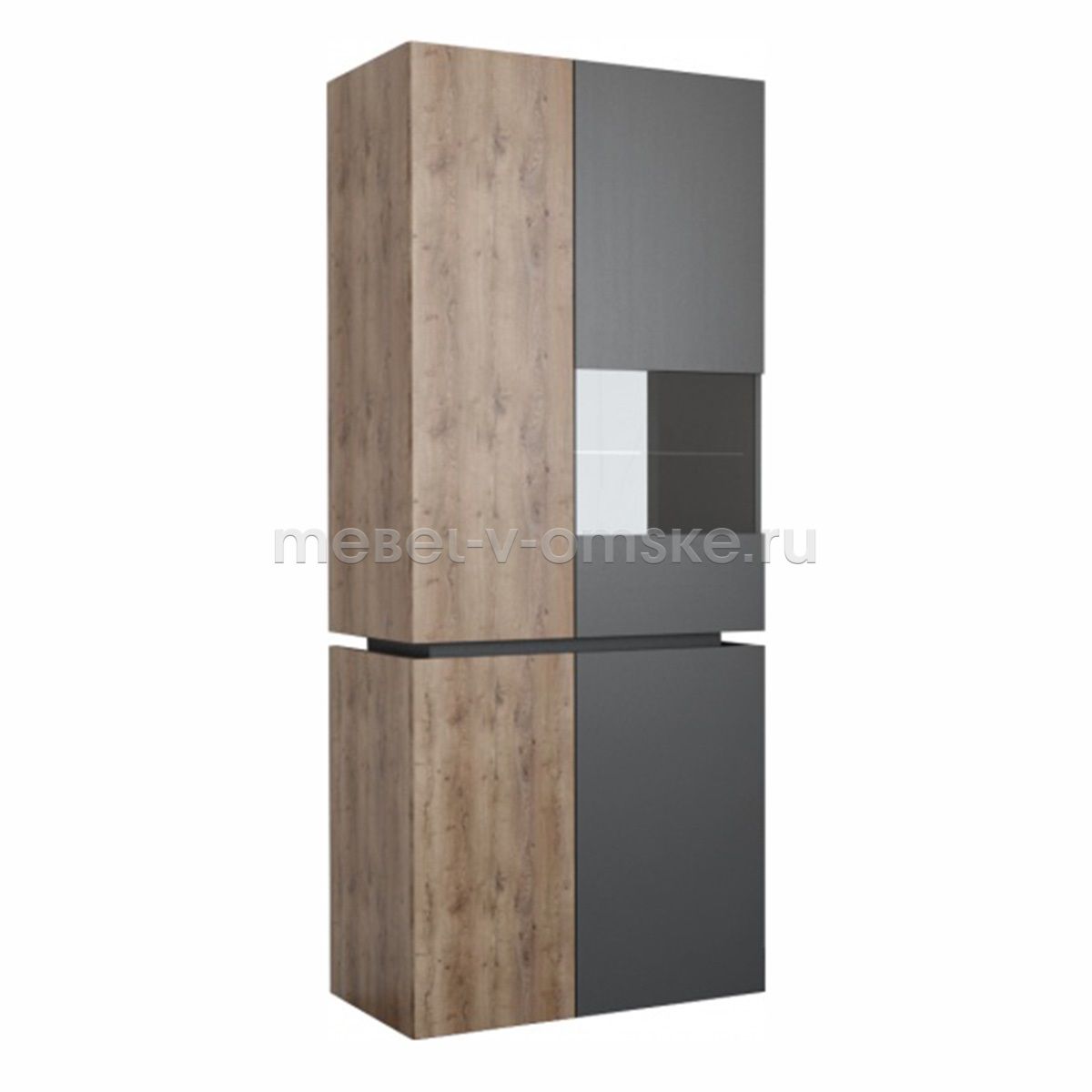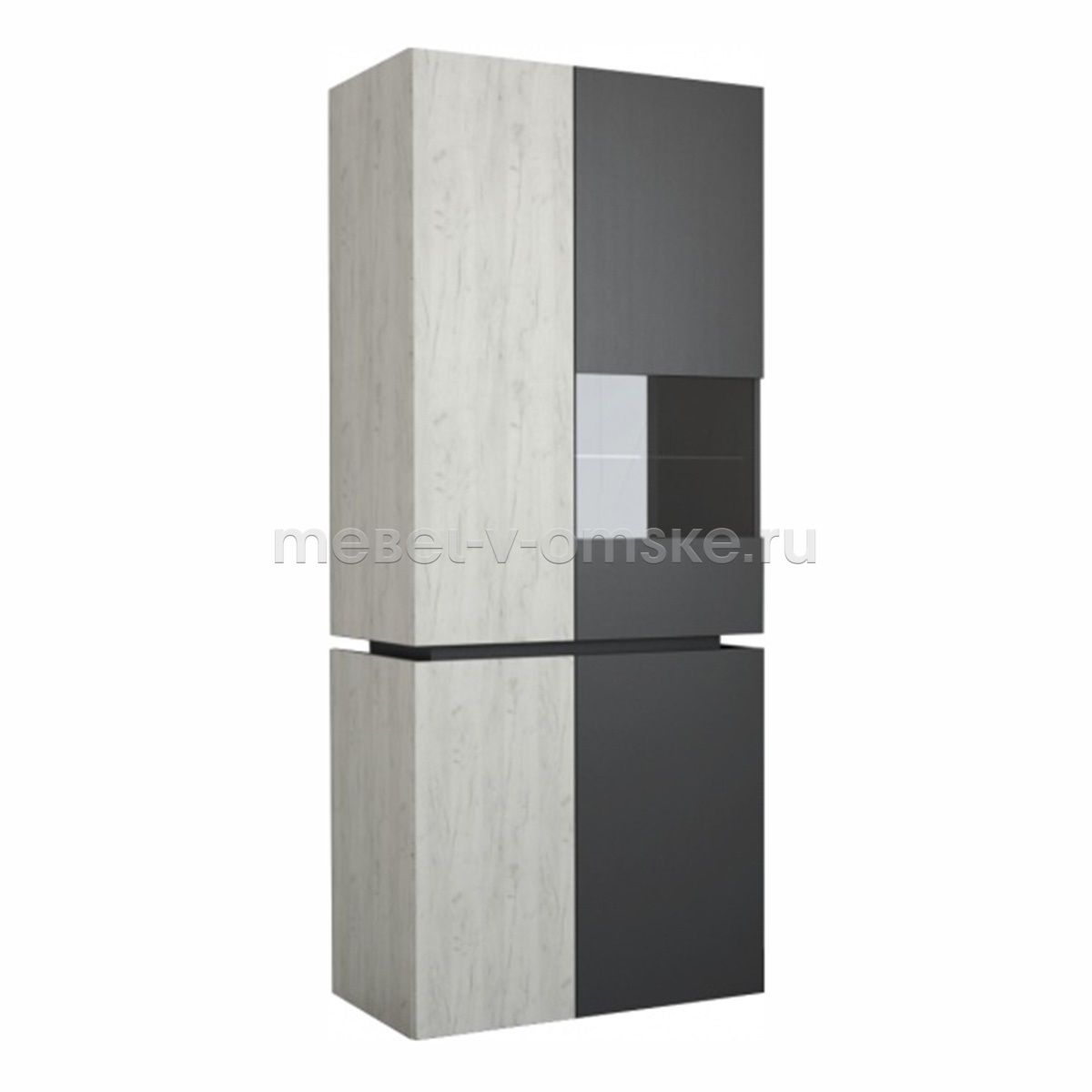 - Конструктив. Пенал оснащен 4 отделениями за распашными дверцами. Верхние отделения - 4 жёстких полки за глухой дверью и две полки из стекла за комбинированной дверцей из стекла и ЛДСП. Нижние отделение оснащено 4 полками за двумя распашными дверями.