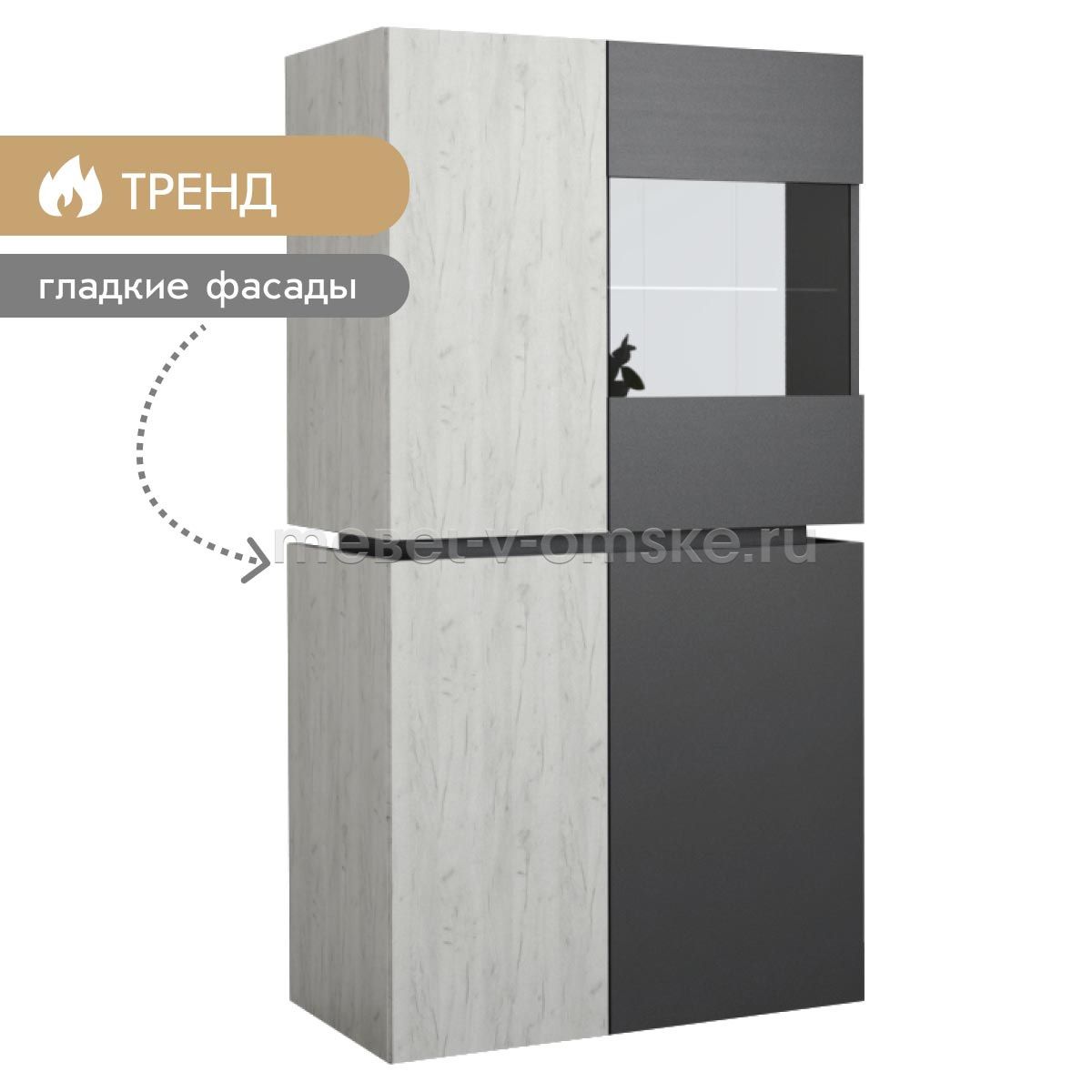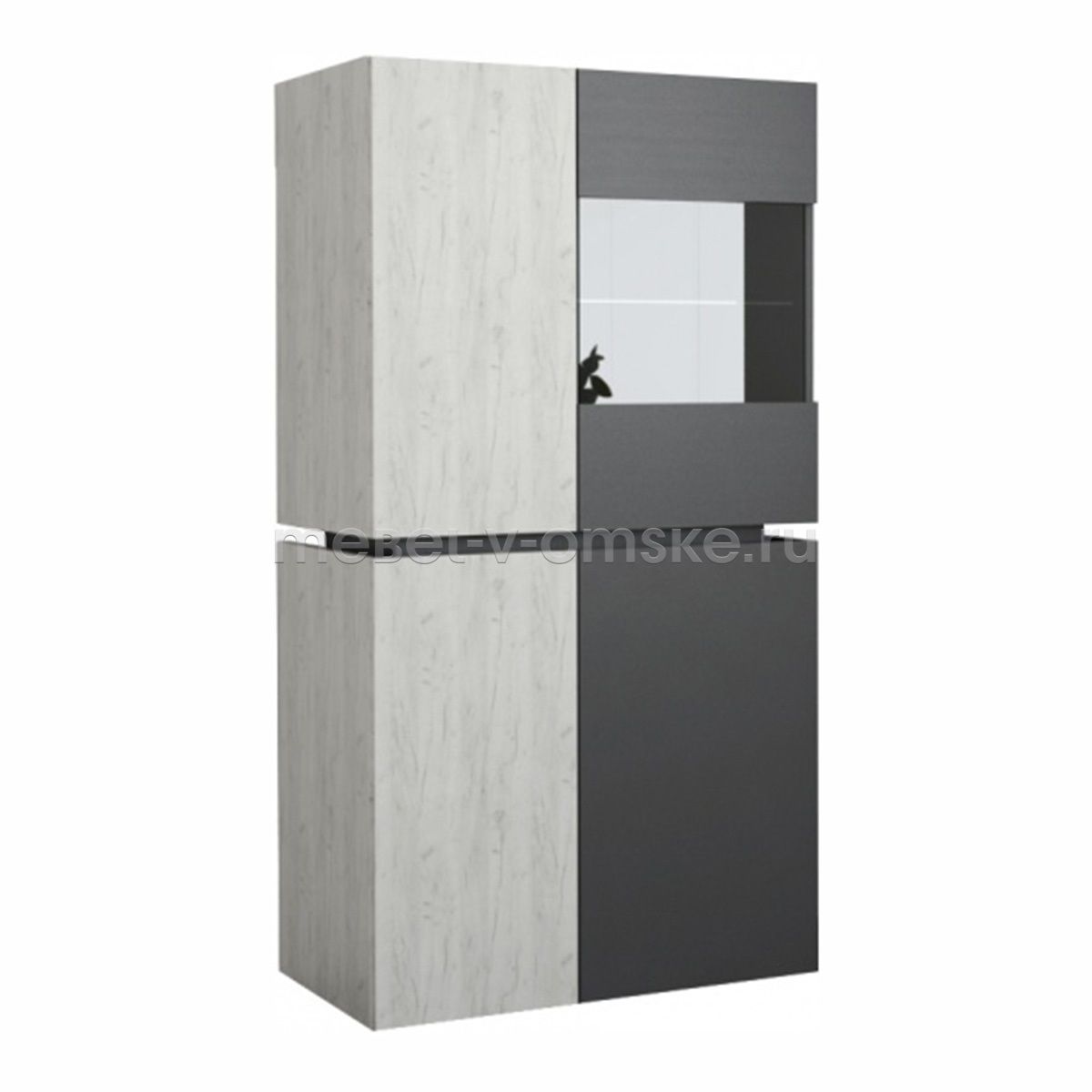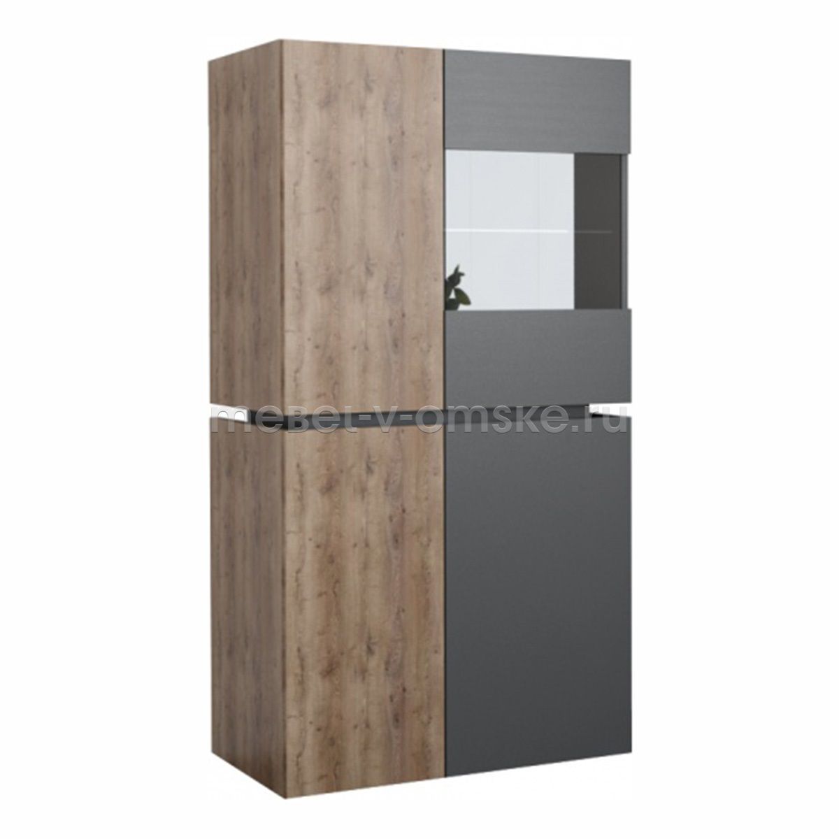 - Конструктив. Пенал оснащен 4 отделениями за распашными дверцами. Верхние отделения - 1 жёсткая полка за глухой дверью и одна из стекла за комбинированной дверцей из стекла и ЛДСП. Нижние отделение оснащено 2 полками за двумя распашными дверями.