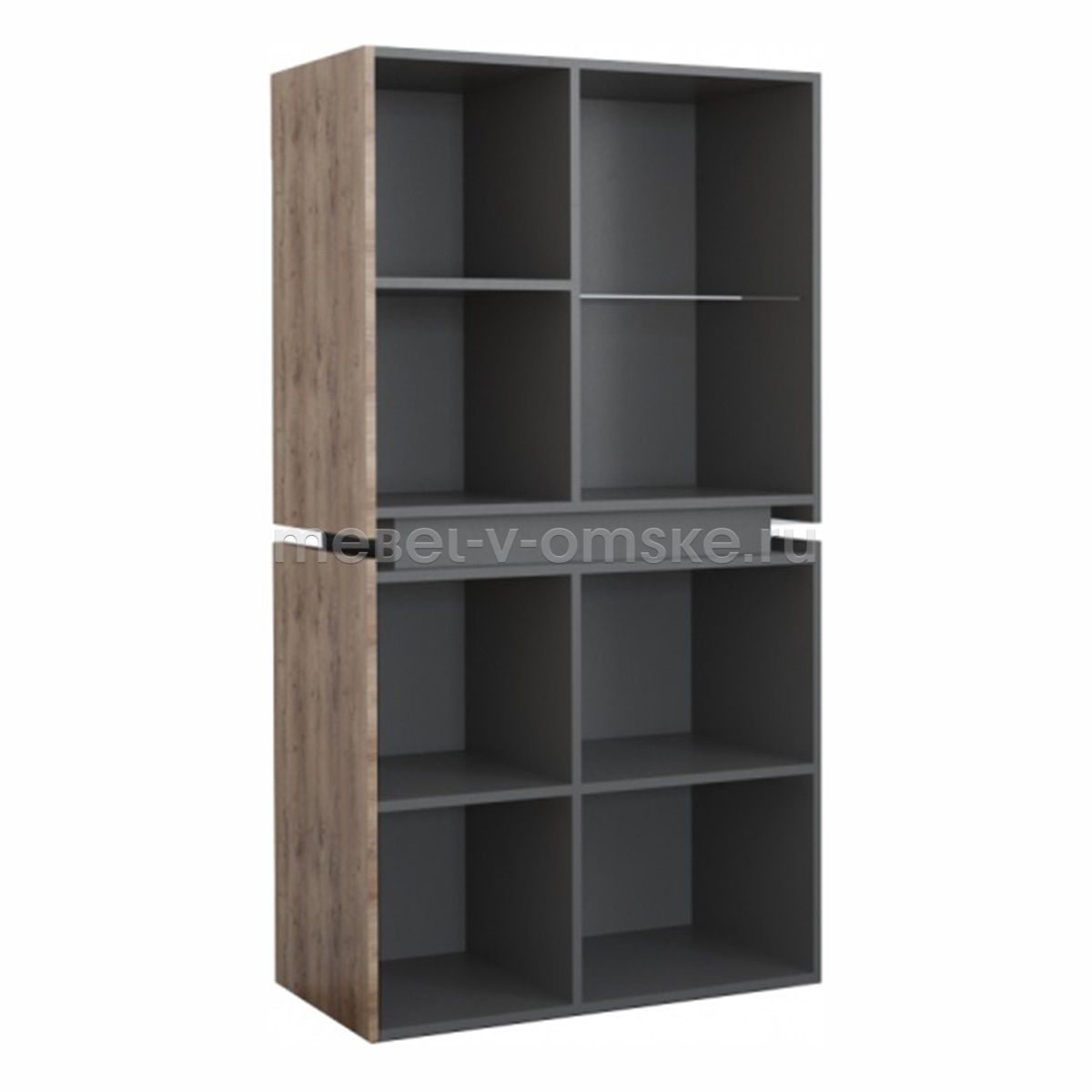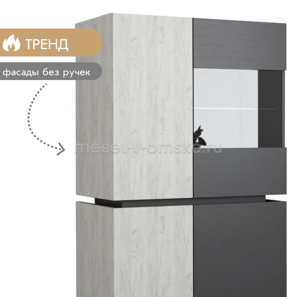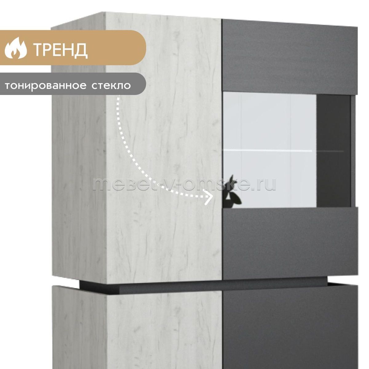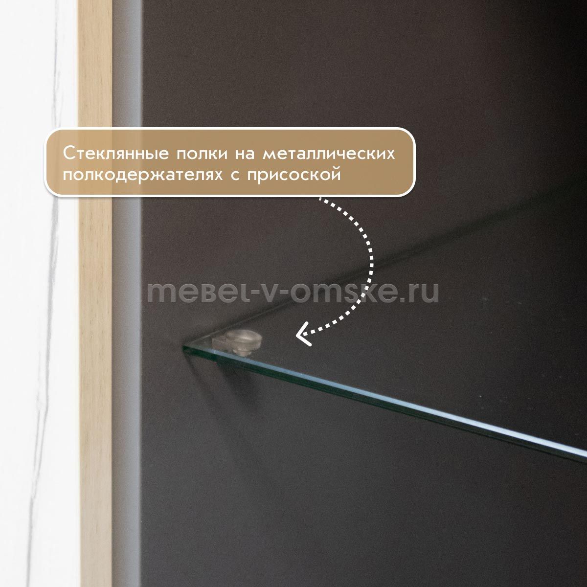 - Конструктив. Пенал оснащен 4 отделениями за распашными дверцами. Верхние отделения - 1 жёсткая полка за глухой дверью и одна из стекла за комбинированной дверцей из стекла и ЛДСП. Нижние отделение оснащено 2 полками за двумя распашными дверями.