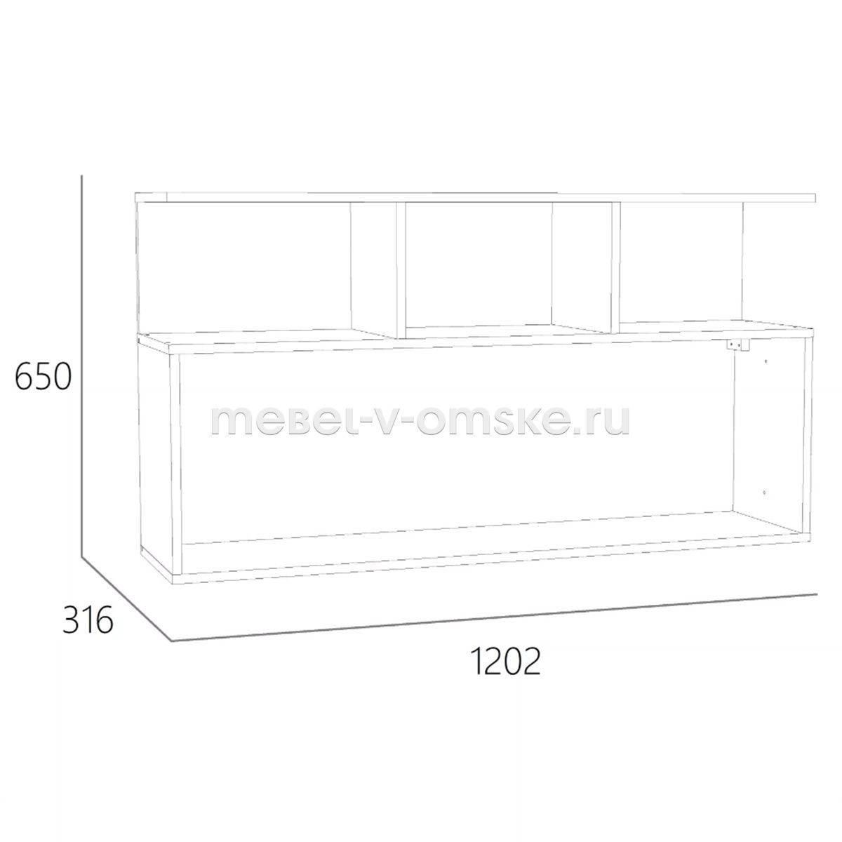 - Конструктив. Нижняя часть модуля оснащена глухим фасадом, который защитит внутреннее содержимое полки от пыли. Для удобства открывания на дверце предусмотрены не одна, а две ручки. Верхние открытые отсеки полки подойдут для демонстрации декоративных элементов.