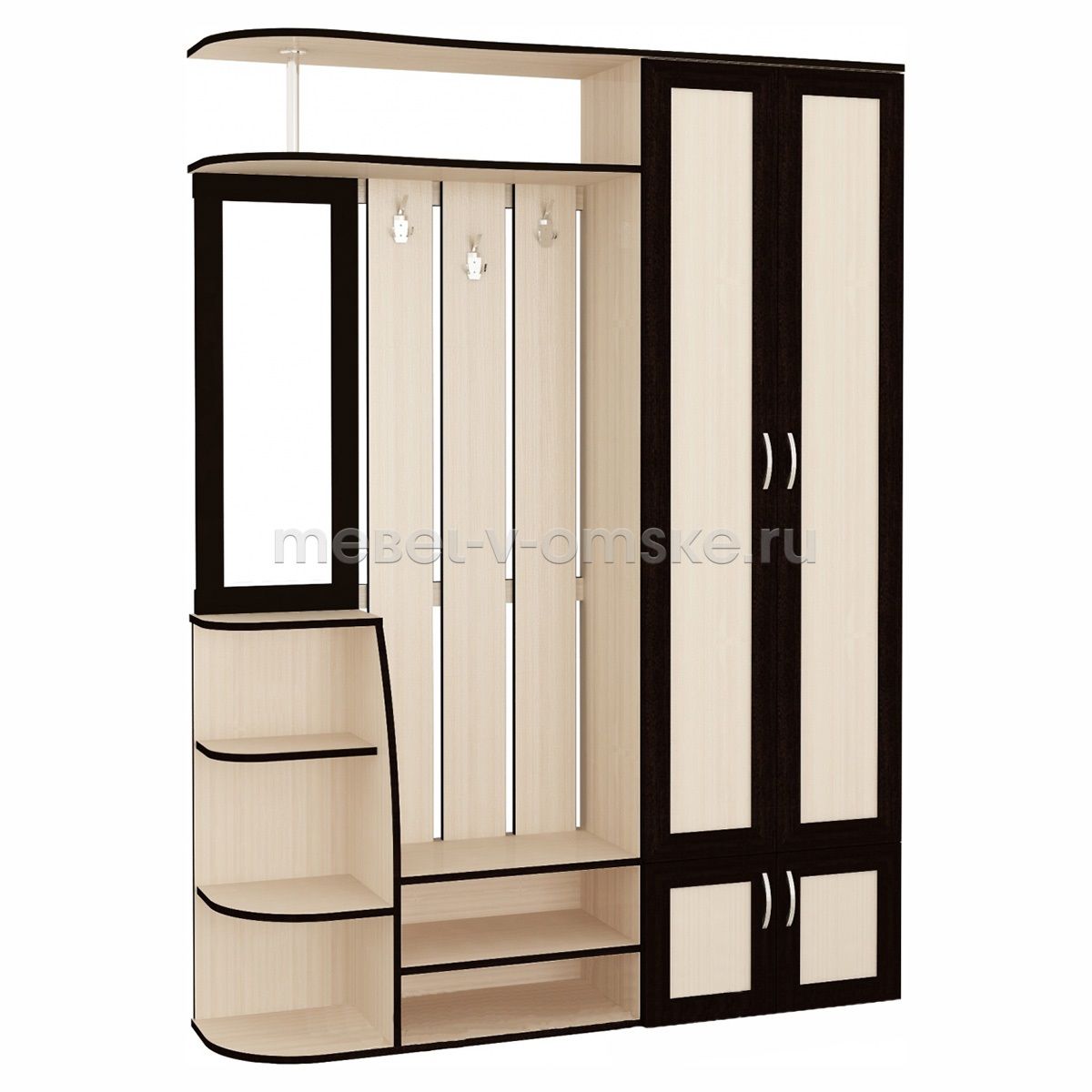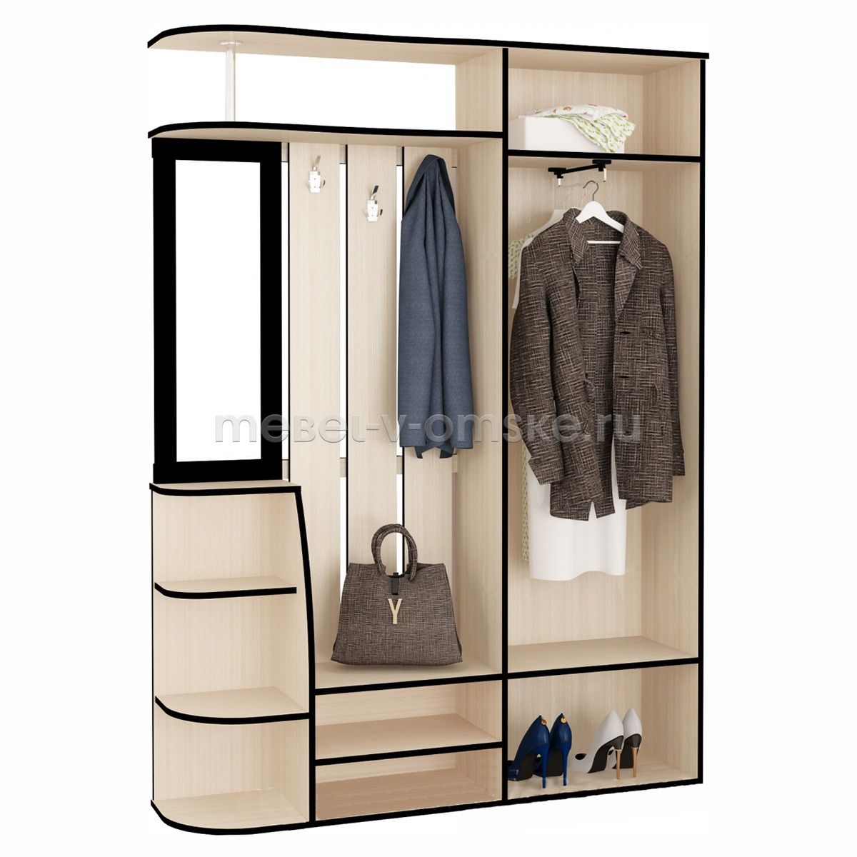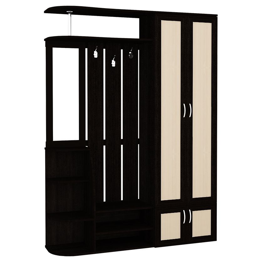 Особенности модели:- Высокая функциональность – здесь есть все, что нужно для обустройства прихожей с комфортом: двухдверный шкаф с кронштейном для одежды на плечиках, открытая вешалка с крючками, удобные ниши для обуви, угловые открытые полки.
