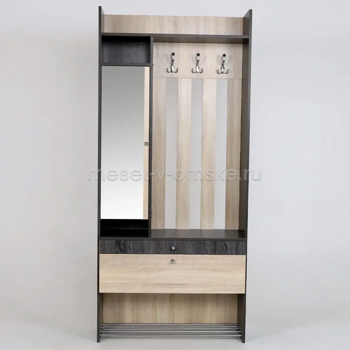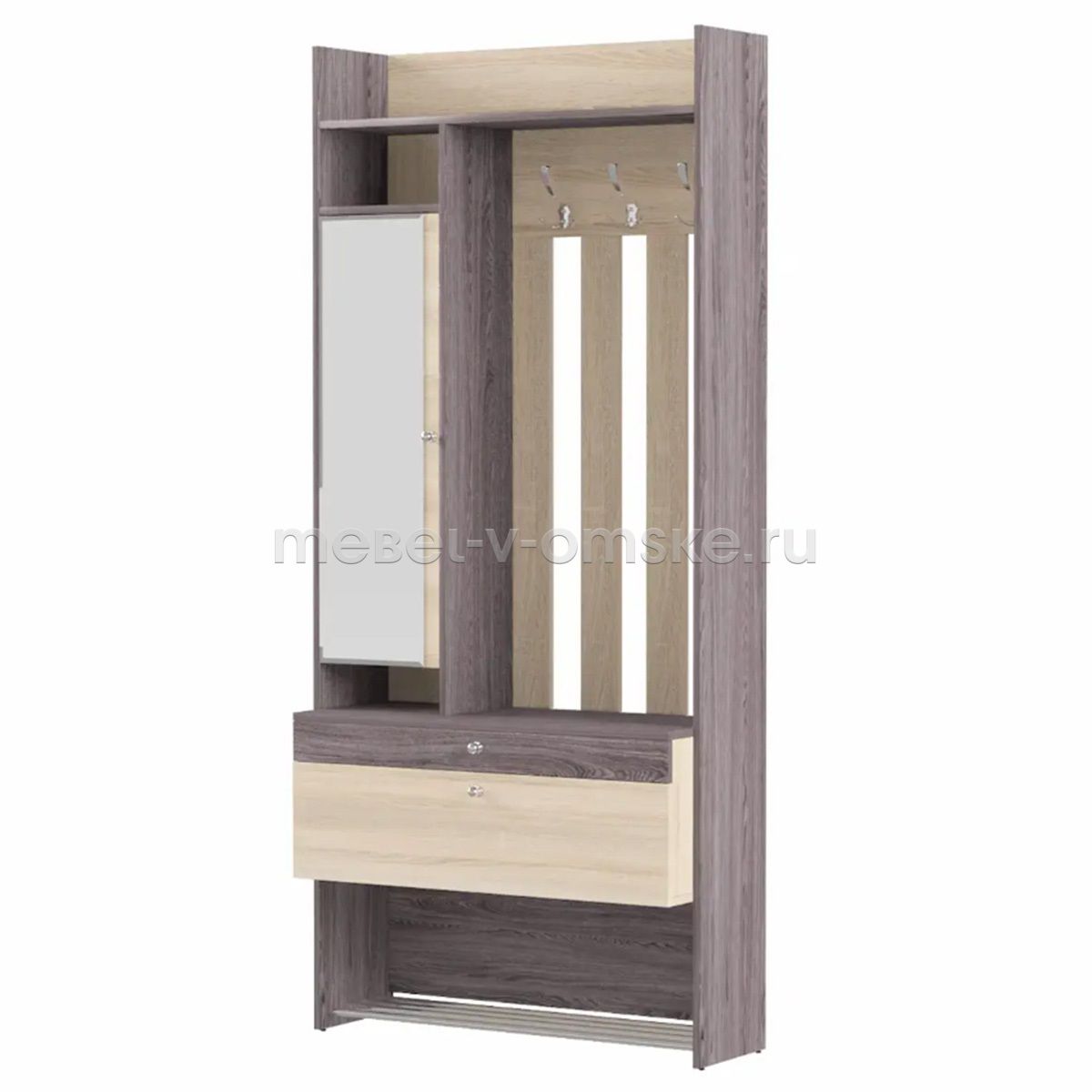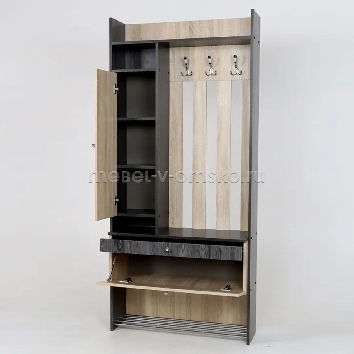 - Фурнитура. Ящики, скользящие на шариковых направляющих, и двери, укомплектованные петлями с доводчиками, обеспечивают плавность в использовании. Металлические ручки и крючки подчеркивают прочность конструкции, а решетки для обуви выполнены из качественного металла, что способствует долговечности.