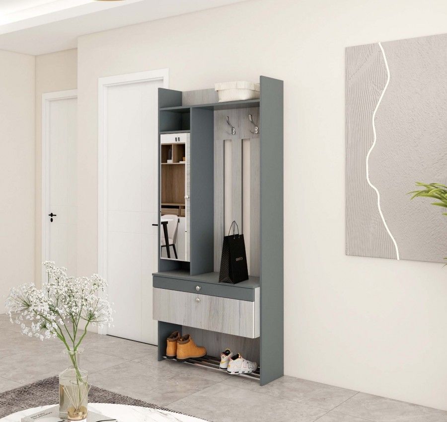 - Цветовое решение. Прихожая выполнена в элегантной комбинации Дуб Эльза и Темно-серый Лофт, создавая утонченный визуальный контраст.