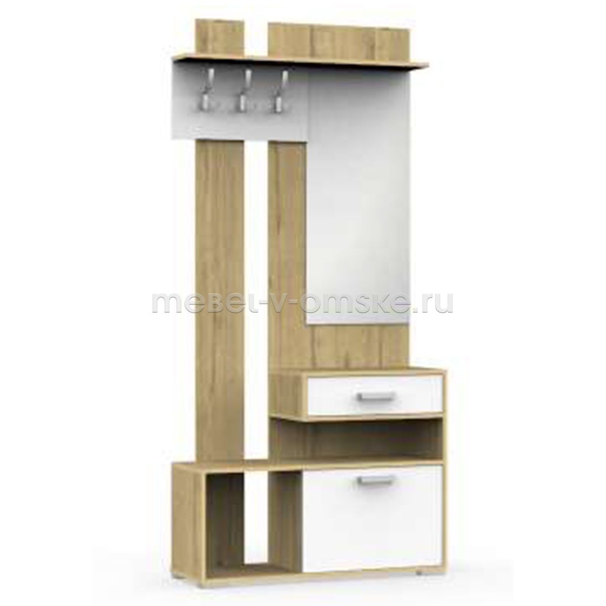 - Функциональность. Наша прихожая – это комплексное решение для организации пространства. Панель с крючками открытого типа обеспечивает удобное размещение верхней одежды, а зеркальное полотно не только добавляет света и визуально расширяет пространство, но и позволяет оценить свой внешний вид перед выходом. Выдвижной ящик идеально подходит для хранения мелочей, а обувница помогает поддерживать порядок и чистоту.