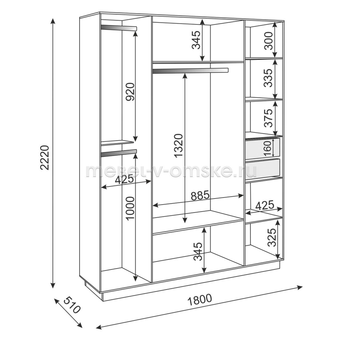 - Внутренние наполнение. Шкаф разделен на три секции. Центральная - оснащена продольной штангой и двумя полками. Секция слева оснащена двумя штангами и полкой. Секция справа оснащена 5 полками и двумя выдвижными ящиками. Задняя стенка ДВПО белого цвета.