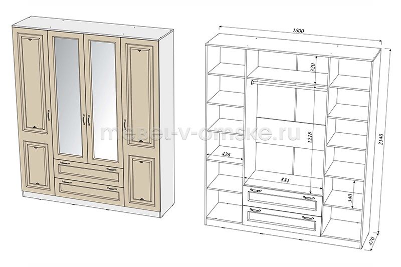Ширина габаритная1800 ммВысота габаритная2140 ммГлубина габаритная470 ммУгловойнетТип дверейраспашныеЧисло дверей4Материал фасадовМДФ + зеркалоДекор фасадовфрезеровкаВыдвижные ящикиестьТип направляющих в ящикахшариковыеШтангастандартнаяМатериал корпусаЛДСПЗеркалоестьВес190 кгКоличество упаковок6 штПоставкав разобранном видеПроизводствоОмскГарантия12 месяцев -