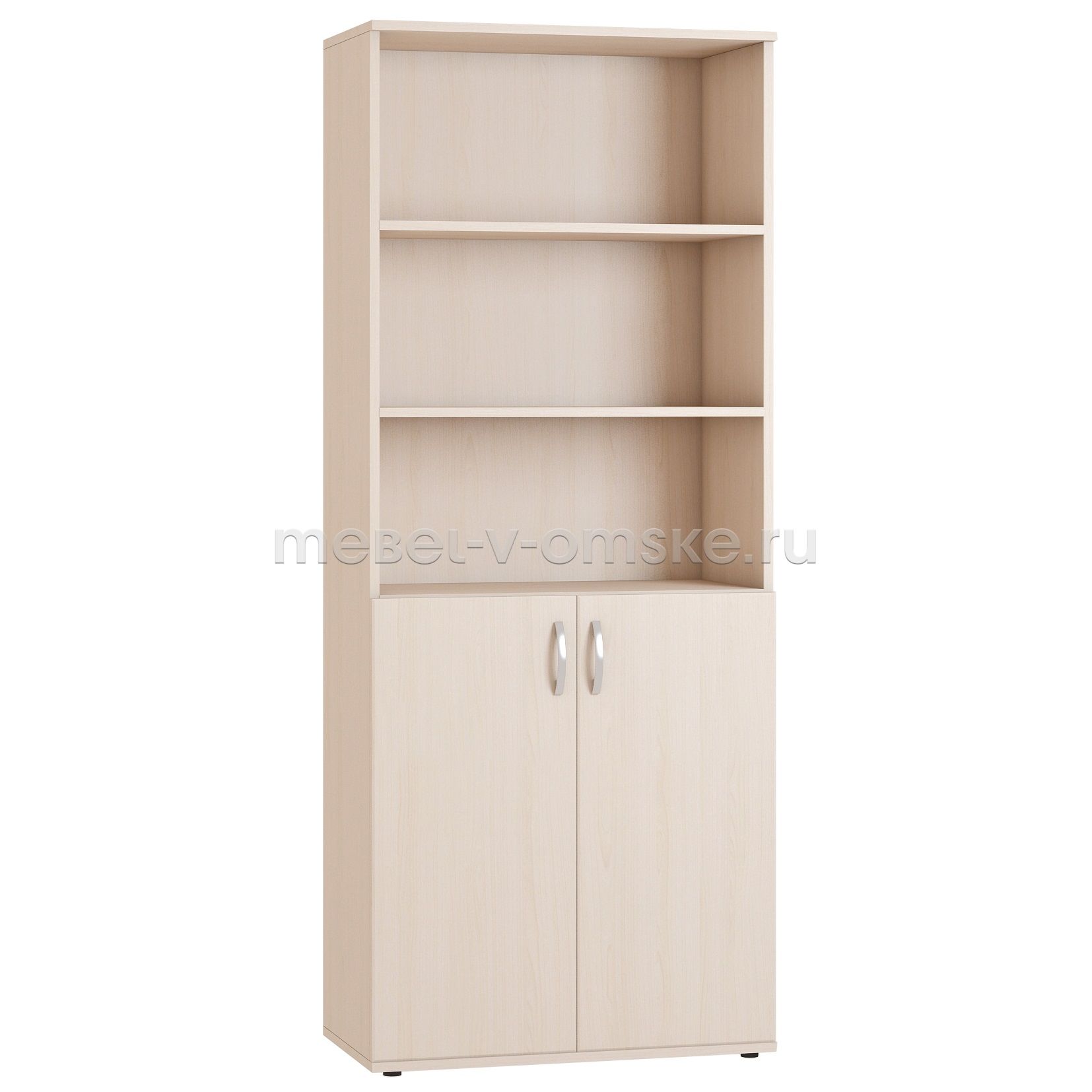 - Отличная вместительность – в верхней части шкафа расположены открытые полки для папок скоросшивателей и офисной документации, в основании отделение с двумя закрытыми дверцами, на полках которого также разместится большой объём рабочих бумаг.