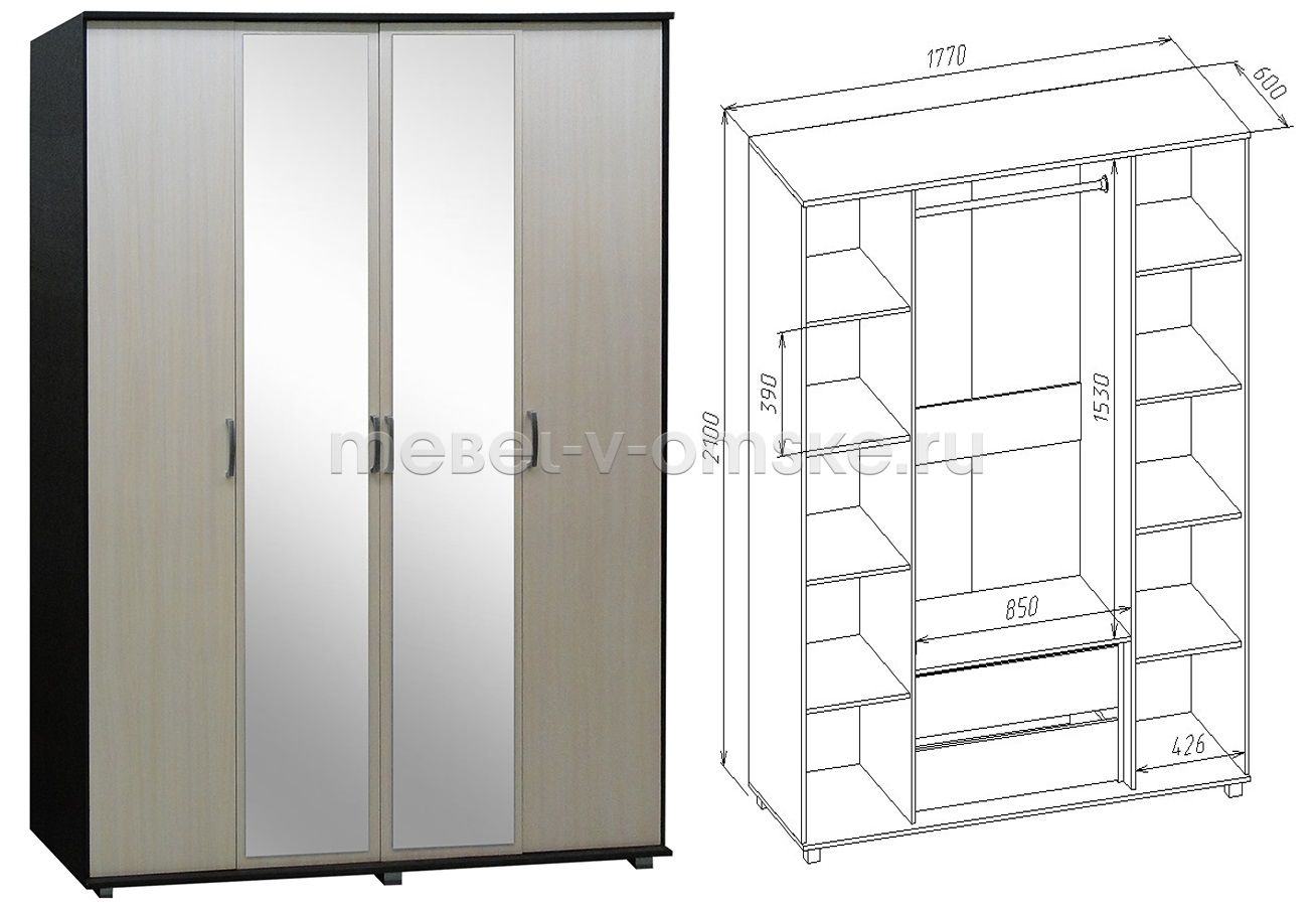 Ширина габаритная1770 ммВысота габаритная2100 ммГлубина габаритная600 ммУгловойнетТип дверейраспашныеЧисло дверей4Материал фасадовЛДСП + зеркалоДекор фасадовфрезеровкаВыдвижные ящикиестьТип направляющих в ящикахроликовыеШтангастандартнаяМатериал корпусаЛДСПЗеркалоестьПоставкав разобранном видеПроизводствоОмскГарантия12 месяцев -