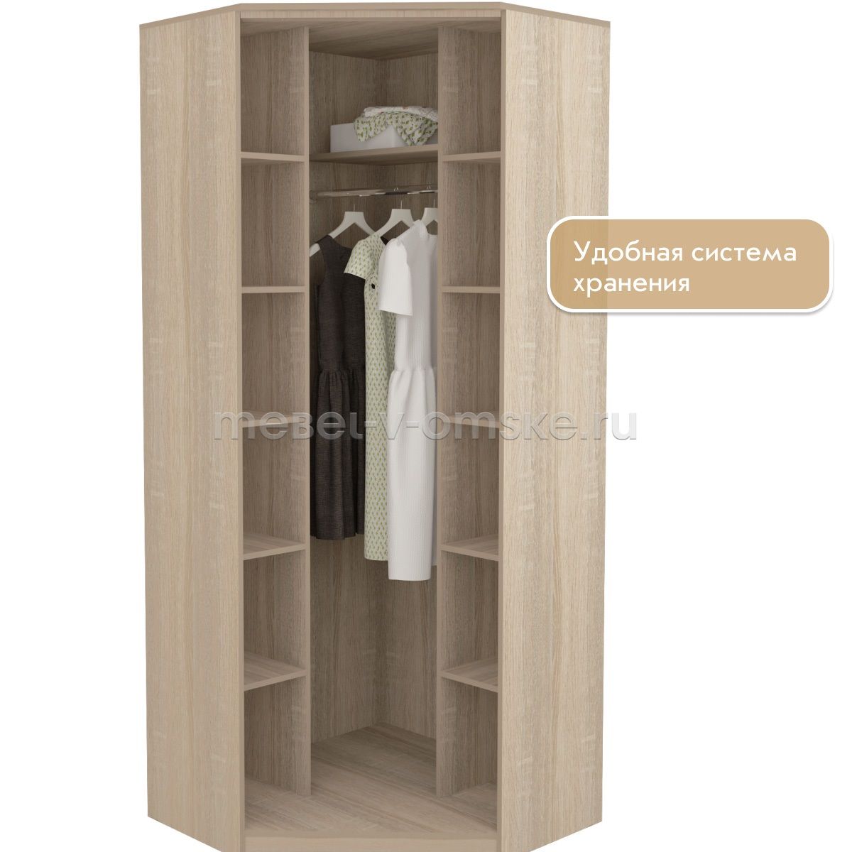 - Два отделения: с полками и штангой – для хранения повседневной и сезонной одежды.