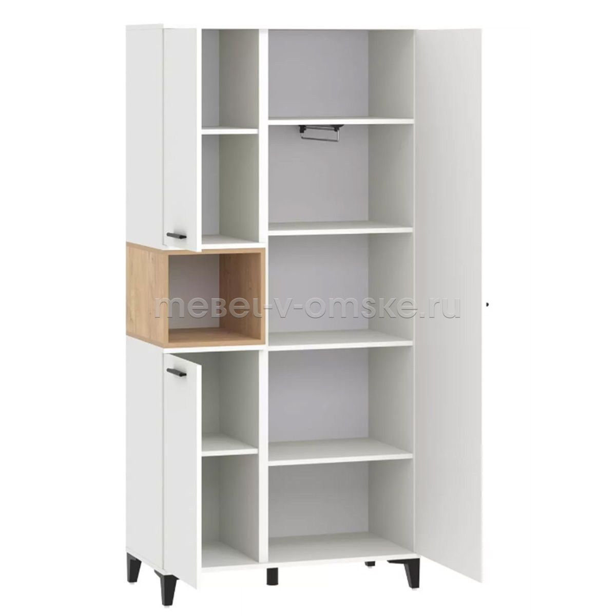 - Конструктив. Шкаф оснащен полками за распашными дверками и открытой нишей, которая может быть собрана как на правую, так и на левую стороны, и в ней можно удобно расположить книги или элементы декора, а высокие опоры придают внешнюю легкость и обеспечивают быстрый и легкий доступ во время уборки.