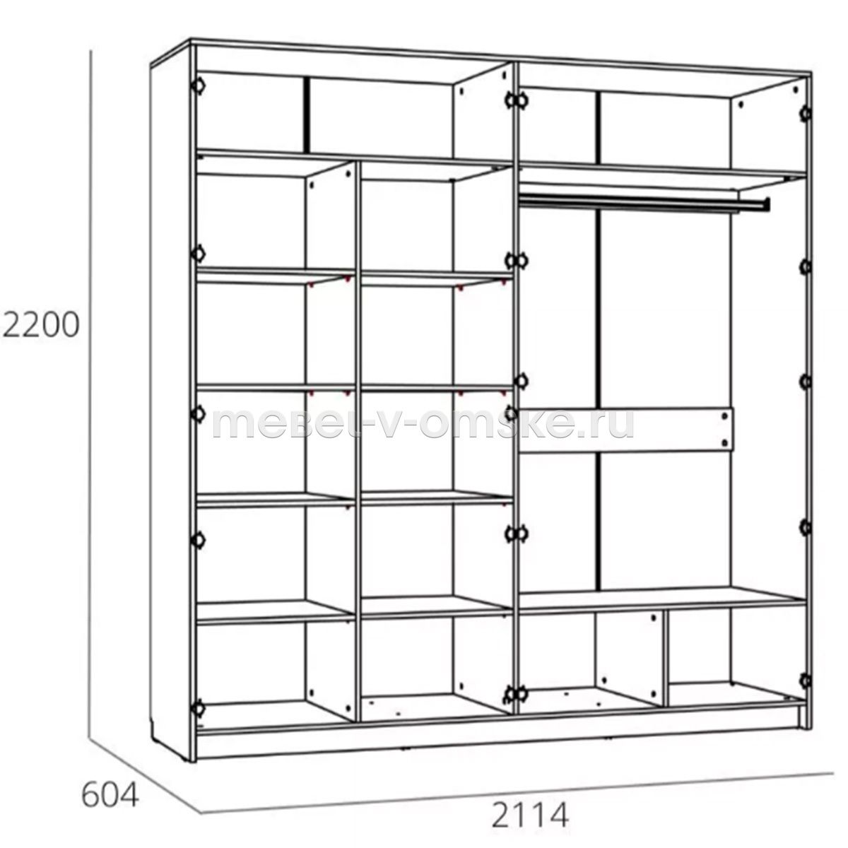 Ширина габаритная2114 ммВысота габаритная2200 ммГлубина габаритная604 ммУгловойнетТип дверейраспашныеЧисло дверей4Материал фасадовМДФ + зеркалоДекор фасадовфрезеровкаВыдвижные ящикинетШтангастандартнаяМатериал корпусаЛДСПЗеркалоестьВес237.2 кгОбъем упаковок0.455 м³Количество упаковок7 штПоставкав разобранном видеПроизводствоБогородскГарантия24 месяца -