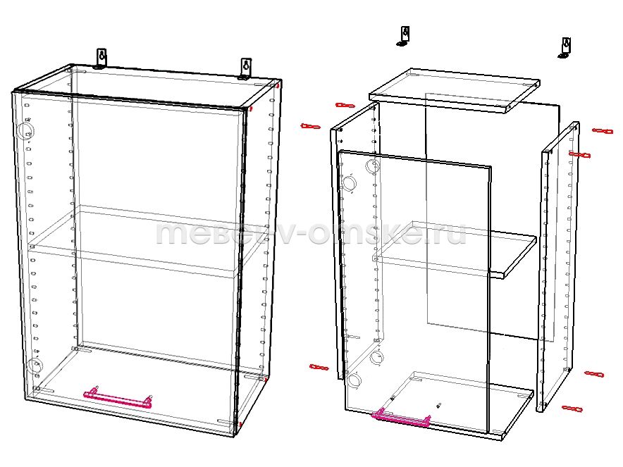 - Полки в модулях устанавливаются на стандартные полкодержатели с бортиком. Благодаря универсальной перфорации на боковинах модулей, полки можно расположить на удобной высоте.