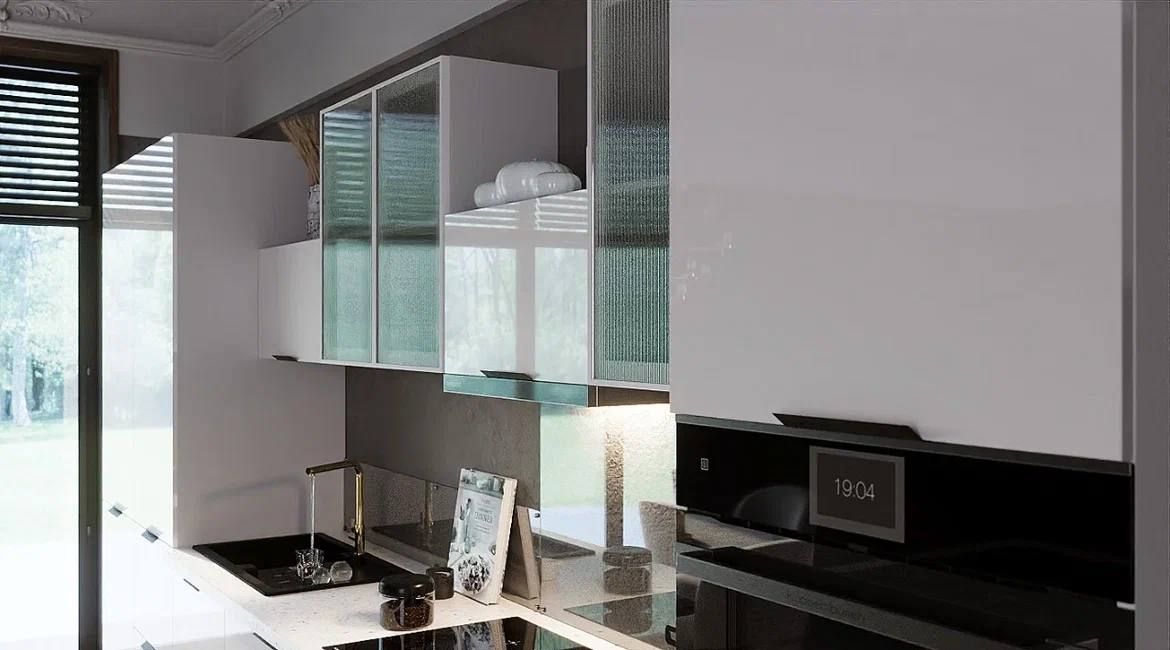 - Материал корпуса пеналов, нижних и верхних ящиков (крышки, дно, боковины, полки) изготавливается из ЛДСП белого цвета. Глубина верхних шкафов которая составляет 550 мм., предназначены для создания антресольной системы шкафов.