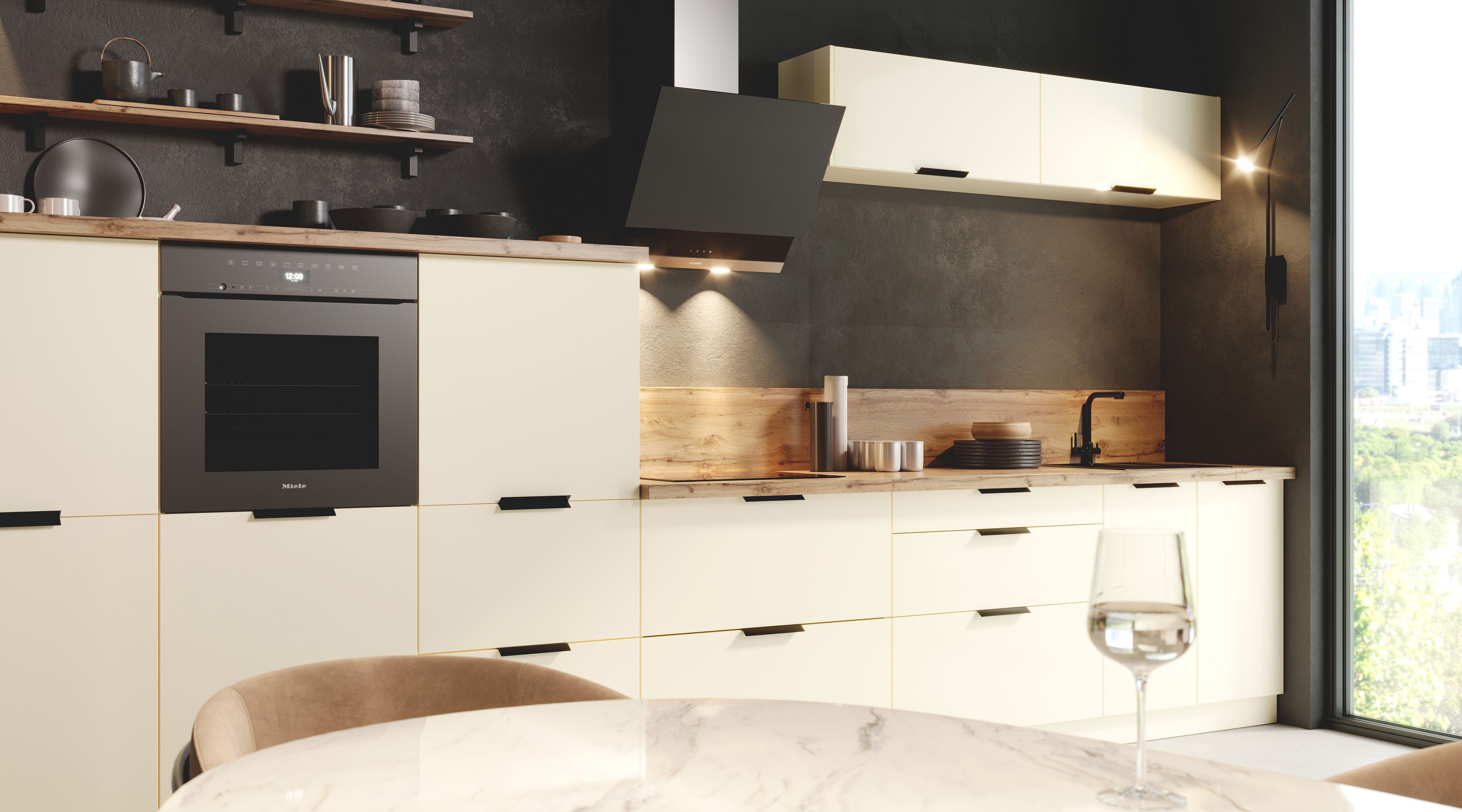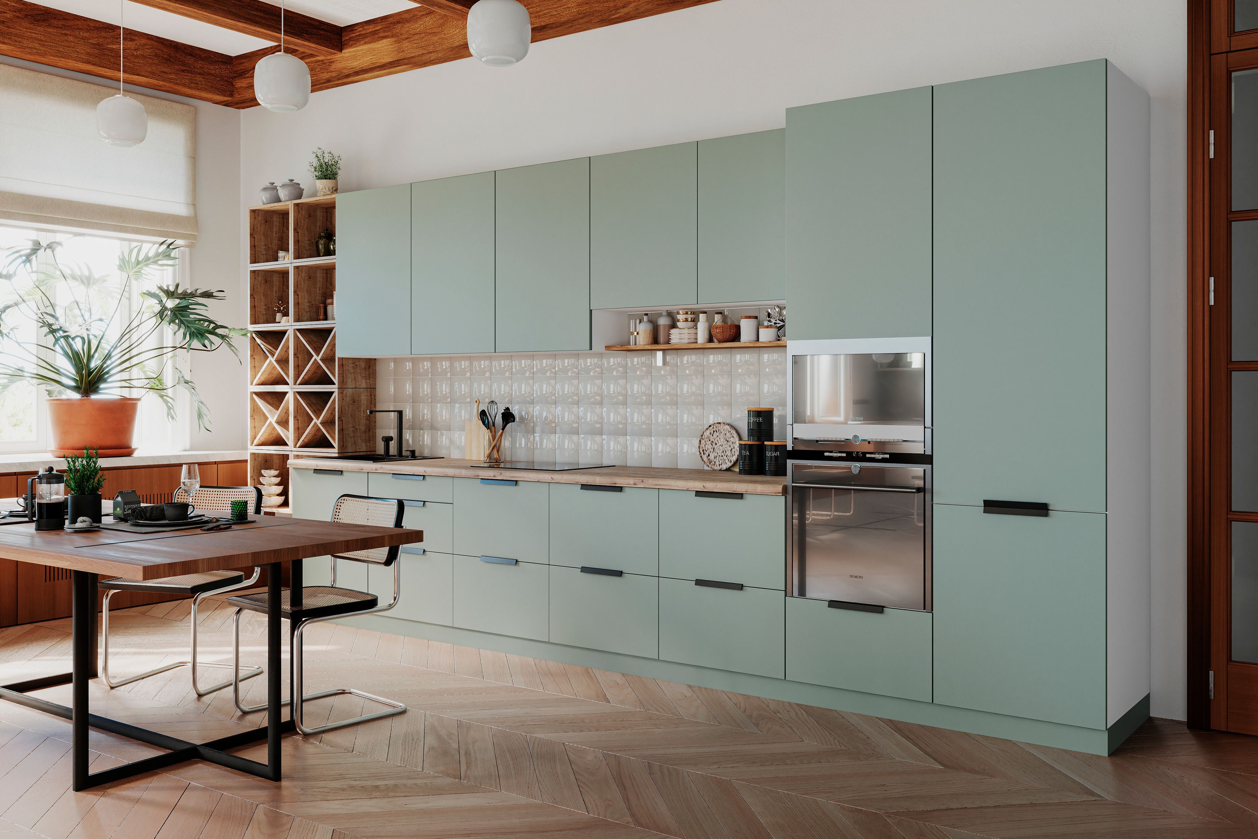 Коллекция «Аттика» черпает вдохновение в архитектурных традициях, воплощая их в современной кухонной мебели. Ключевая особенность — фасады толщиной 16 и 18 мм с покрытием из акрилового пластика Acrylit.