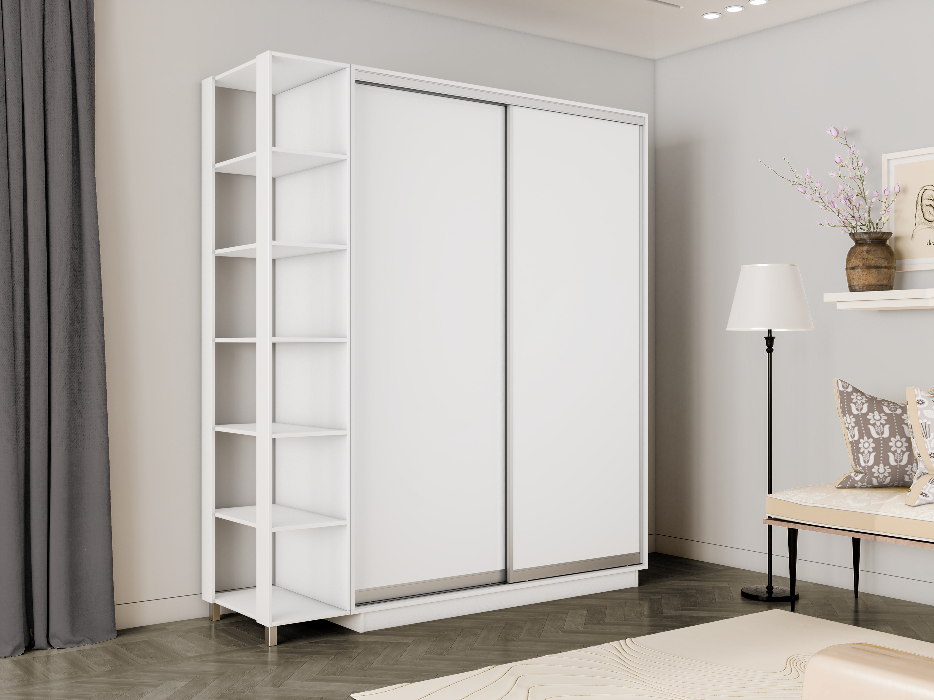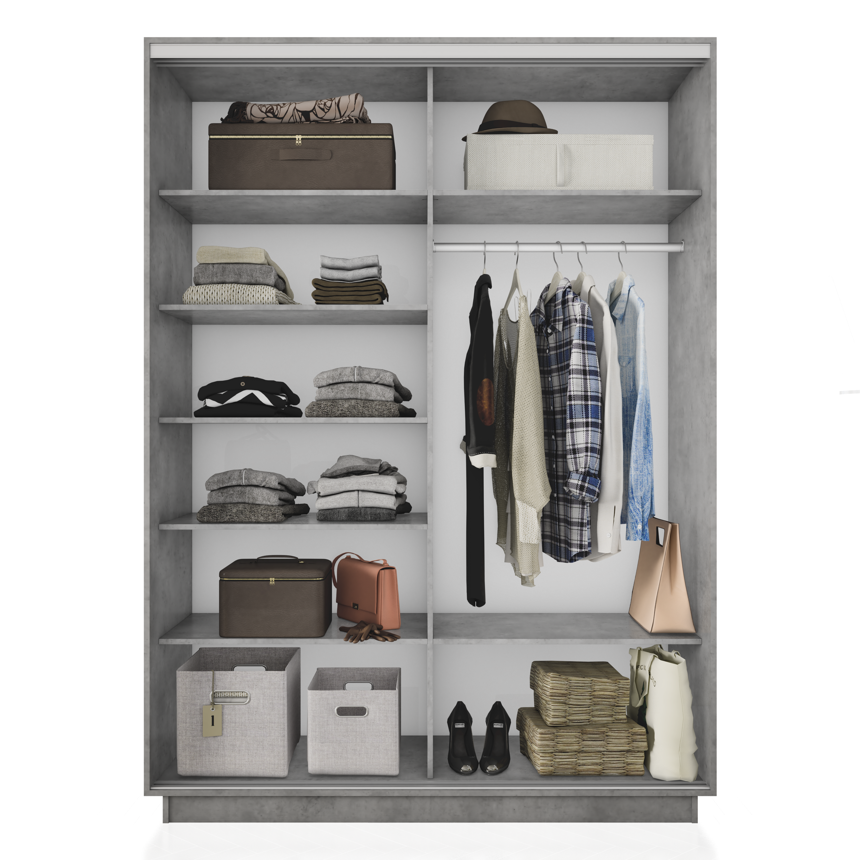 - Продуманная система хранения – шкаф оснащён двумя отделениями: первое с полками для стопок белья и вещей, второе с антресольной и нижней полками и выдвижной хромированной штангой для одежды на плечиках.