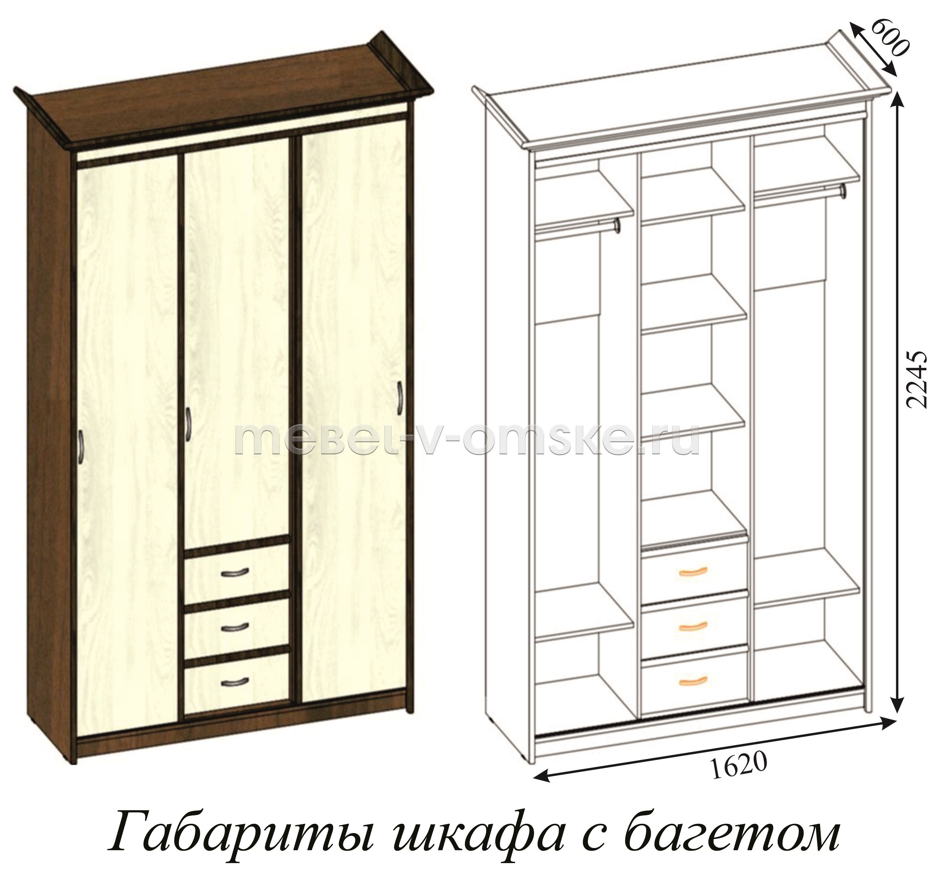 - Карниз. Шкаф возможно украсить карнизом - это профильная планка прикручивающаяся к крышке шкафа. Цвет карниза подбирается в цвет накладок МДФ на дверцах шкафа. Габарит шкафа скарнизом: 1620х2245х600. Обратите внимание! Если промежуток между шкафом и потолком менее 35 см - установить карниз нет возможности. Карниз приобретается отдельно, для комплектации пройдите по ссылке "Багет-профиль EL17".